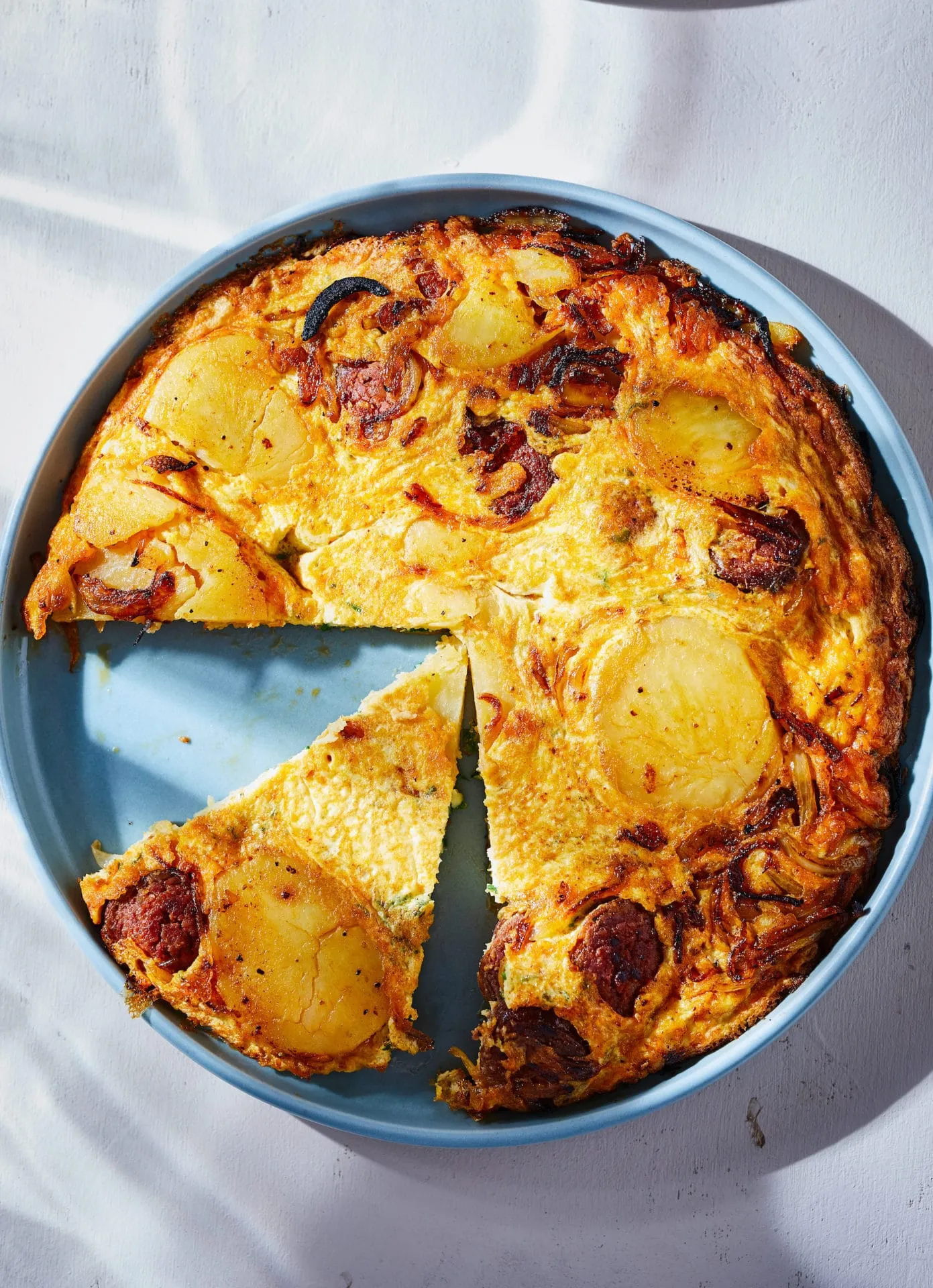 A burgonyát meghámozzuk, felszeleteljük, sós vízben megfőzzük – de vigyázzunk, hogy még legyen tartása –, és leszűrjük. A felszeletelt hagymát és fokhagymát elkezdjük pirítani egy sütőbe helyezhető serpenyőben az olívaolajon, majd rádobjuk a felszeletelt kolbászt, és amikor ezzel is pirítottuk pár percig, jöhet rá a burgonya. Óvatosan pirítjuk tovább, majd felütjük a tojásokat, sózzuk, borsozzuk, hozzáadjuk a tormát, felverjük, majd a kolbászos, hagymás, burgonyás mixre öntjük, és 200 fokra előmelegített sütőbe helyezzük kb. 5-10 percre.