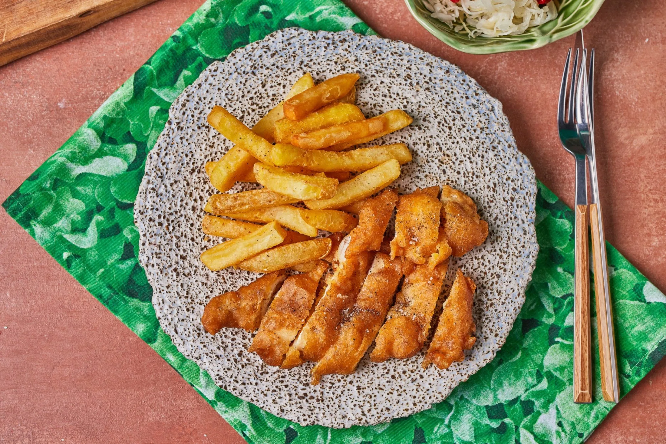 A lisztet, a keményítőt, a szódabikarbónát, a sót, a tojást és a vizet egy tálban simára keverjük. Az így kikevert tésztának sűrűbbnek kell lennie a hagyományos palacsintatésztánál. A csirkemellet hosszában vékony, 5 mm-es szeletekre vágjuk. Kicsit ki is klopfolhatjuk, hogy mindenhol egyenletesen lapos legyen.