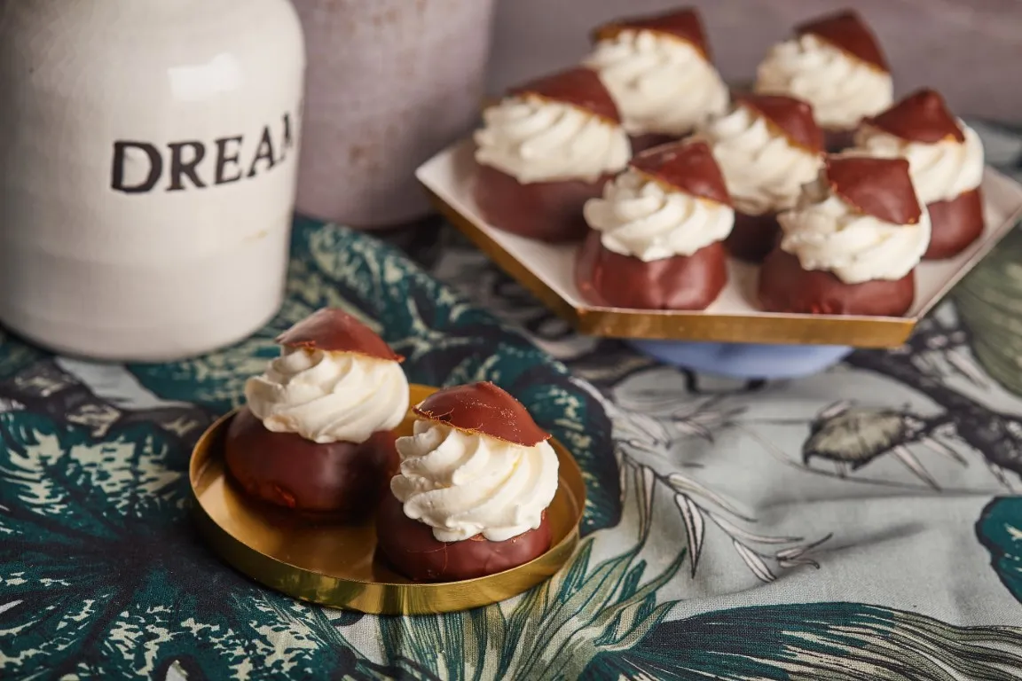 Mikor kihűltek, felmelegített sárgabaracklekvárral lekenjük, majd 5 perc pihi után megmártjuk őket, pár csepp olajjal elkevert olvasztott csokiban. Mikor a csoki megdermedt éles késsel levágjuk a felső harmadukat, az alsó részének pedig kiszedünk a közepéről 1-1 csipet tésztát. A hideg tejszínt habbá verjük. Amikor más stabilabb hozzáadjuk a porcukrot és megtöltjük vele a sütik alját, majd rárakjuk a csokis kalapokat.