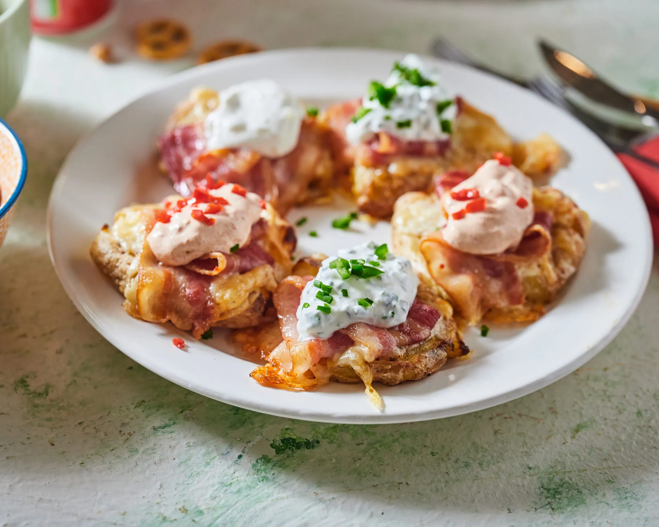 A jalapeno poppers lapított krumpli egy olyan kaja, amivel bármelyik vendégségben bevágódhattok. Első lépésként a burgonyákat megmossuk és még vizesen megsózzuk. Mikróban, maximális fokozaton kb. 10 perc alatt puhára „főzzük”, majd egy sütőpapírral bélelt tepsire pakoljuk és egy pohár aljával összepréseljük őket. Meglocsoljuk a krumplikat egy kevés olajjal, sózzuk, borsozzuk és a 200 fokra előmelegített sütőben 10 perc alatt elősütjük. Ezután megszórjuk mindegyik krumplit reszelt sajttal, fektetünk rá egy-egy baconszeletet, majd további 15 perc alatt készre sütjük.