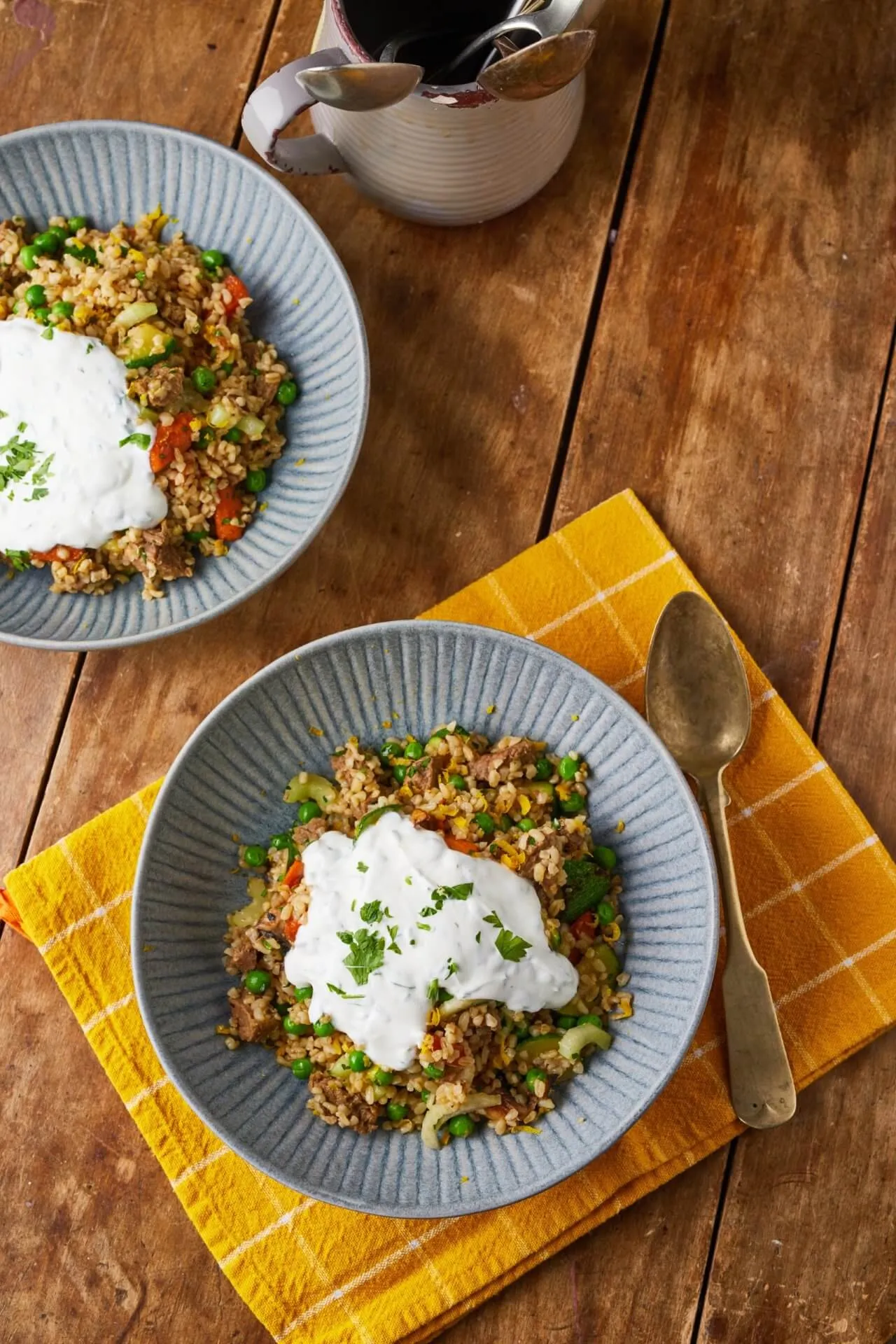 Ha esetleg sok folyadék maradt a bulgur alatt, akkor átszűrjük a zöldségekkel együtt, majd hozzákeverjük a húshoz. Belefacsarjuk a citrom levét, majd tányérra szedjük. Nyakon öntjük egy adag joghurttal, reszelünk rá a citrom héjából, és megszórjuk aprított petrezselyemmel.
