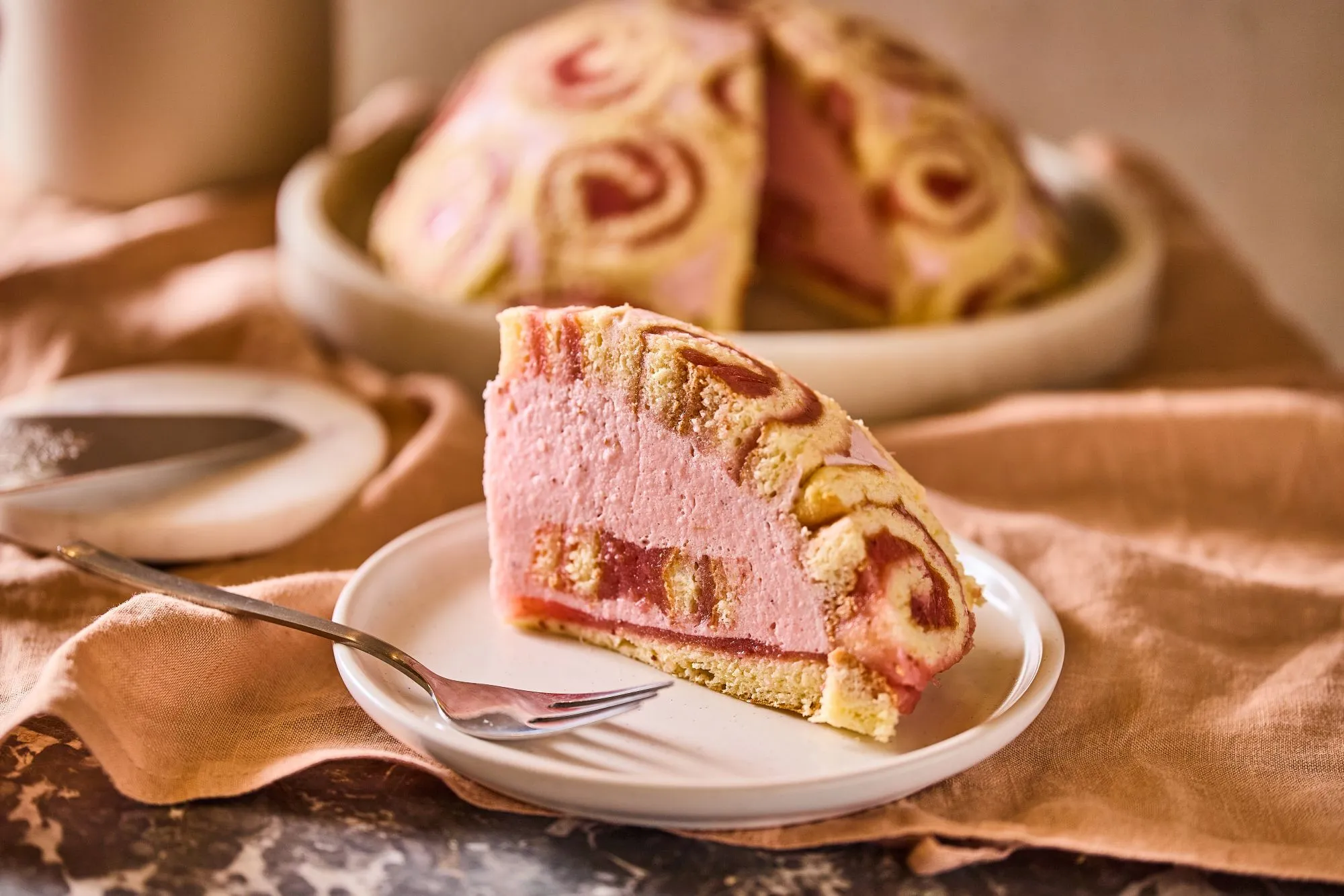Beleöntjük az epres-joghurtos mousse-t, beletesszük a maradék tekercset, majd a kör alakú piskótával lezárjuk a tetejét úgy, hogy a lekváros rész legyen belül. Lefóliázzuk, és egy éjszakára hűtőbe tesszük. Tálalás előtt leszedjük az aljáról a fóliát, majd egy tányér segítségével megfordítjuk a formát, és csak utána emeljük le róla a félgömb alakú edényt.