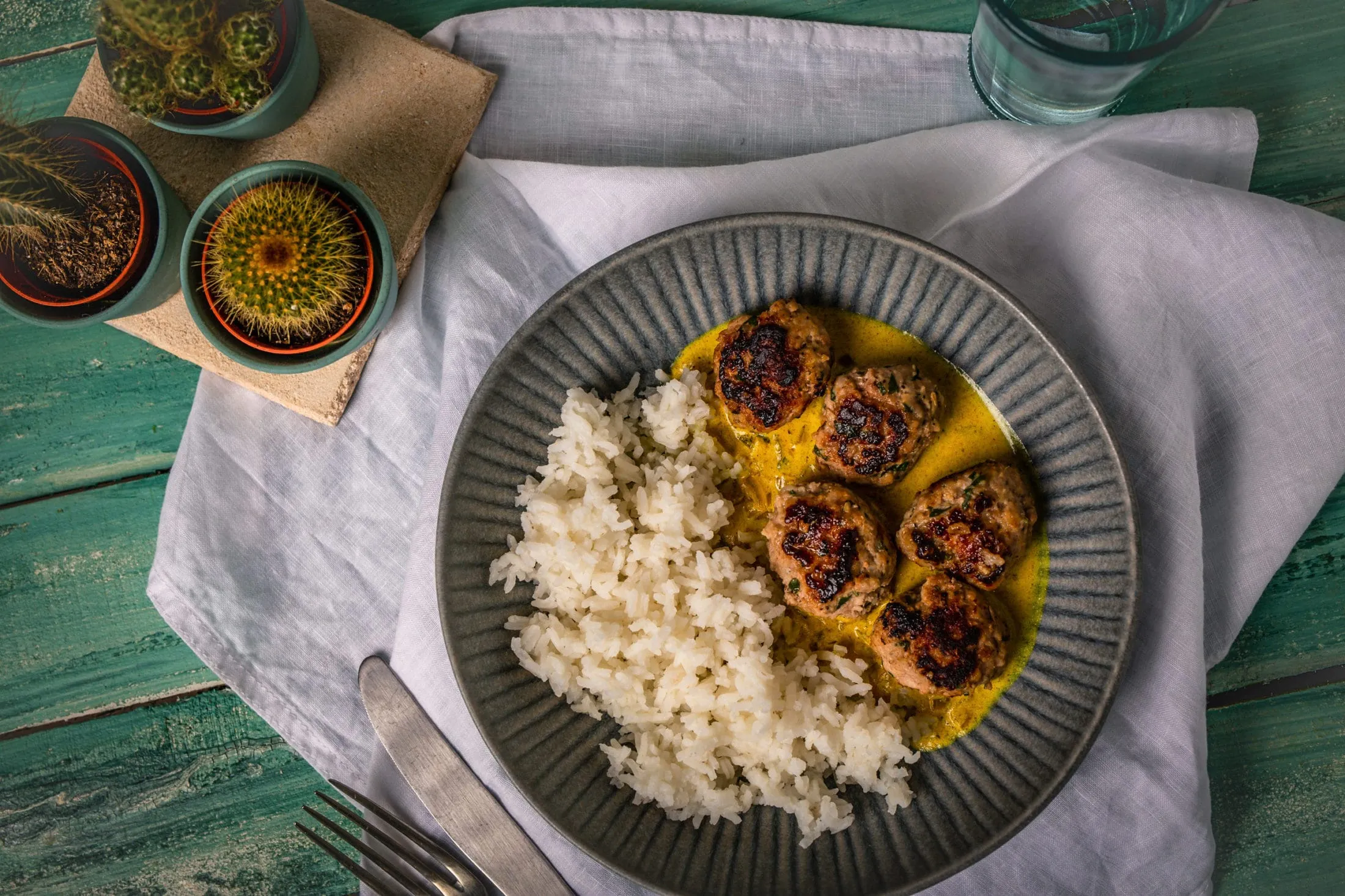 A visszamaradt szafton a mártáshoz kicsit lepirítjuk az apróra vágott hagymákat, gyömbért, megszórjuk a curryporral, elkeverjük, sózzuk, borsozzuk, és felöntjük a vízzel. Kicsit visszaforraljuk, belerakjuk a joghurtot, hagyjuk, hogy rottyanjon egyet, és a húsgolyóval és a rizzsel tálaljuk.