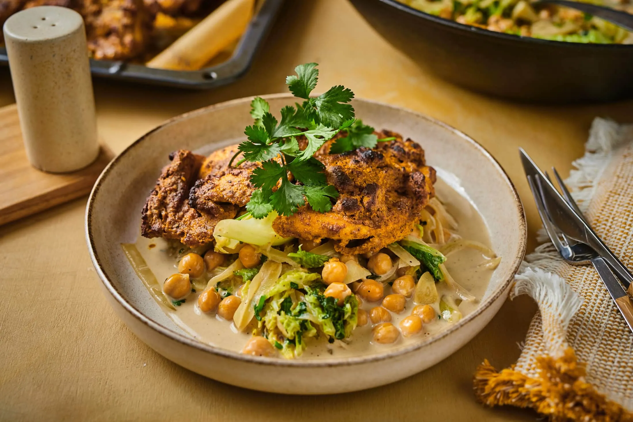 Joghurtos indiai csirkecomb kelkáposztás-kókusztejes csicseriborsó-raguval