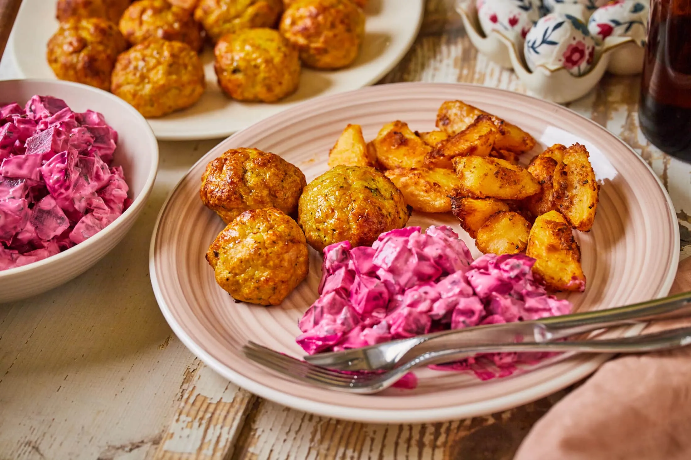 A sültcékla-saláta zöldséges fasírttal elkészítéséhez a céklát megmossuk, ha nagyobbakat találtunk akkor 2-3 darabba vágjuk, ha közepeseket, akkor egészben hagyjuk, lekenjük egy kevés olajjal és megsózzuk. Alufóliába csomagoljuk, tepsire rakjuk és 200 fokra előmelegített sütőben legalább 80-90 percig sütjük.