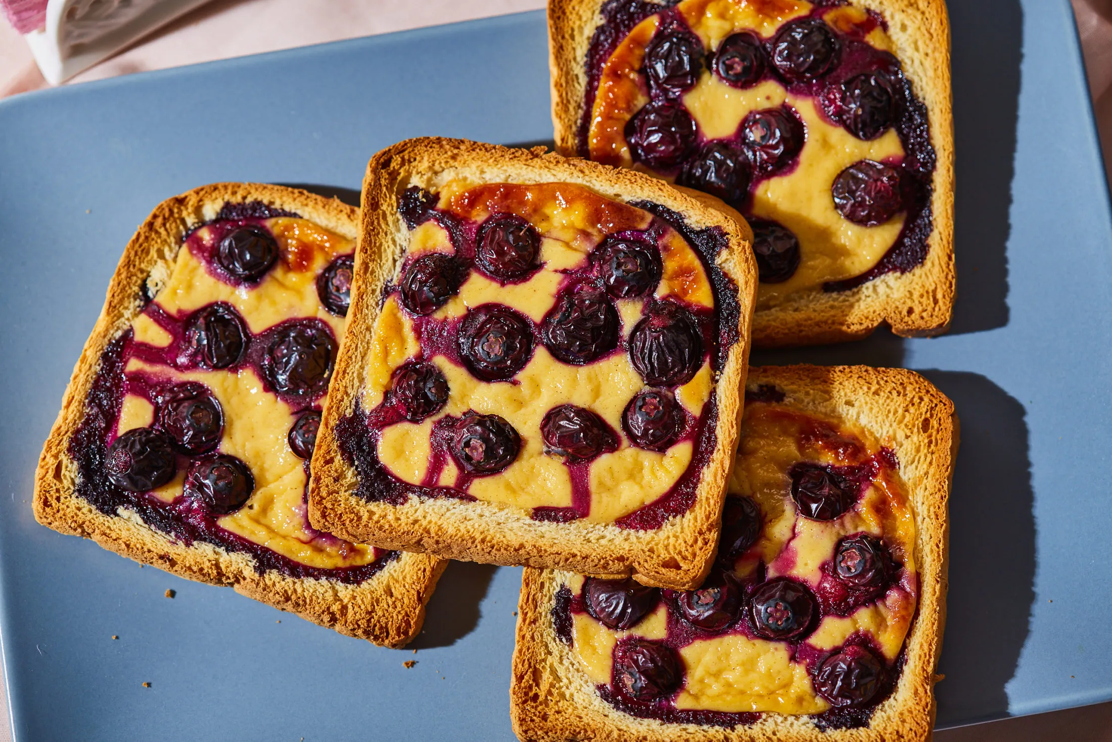 Egyenletesen elosztjuk a kenyereken a joghurtos keveréket. Ezután megszórjuk az áfonyával, és 180 fokos sütőben 22-25 perc alatt megsütjük.