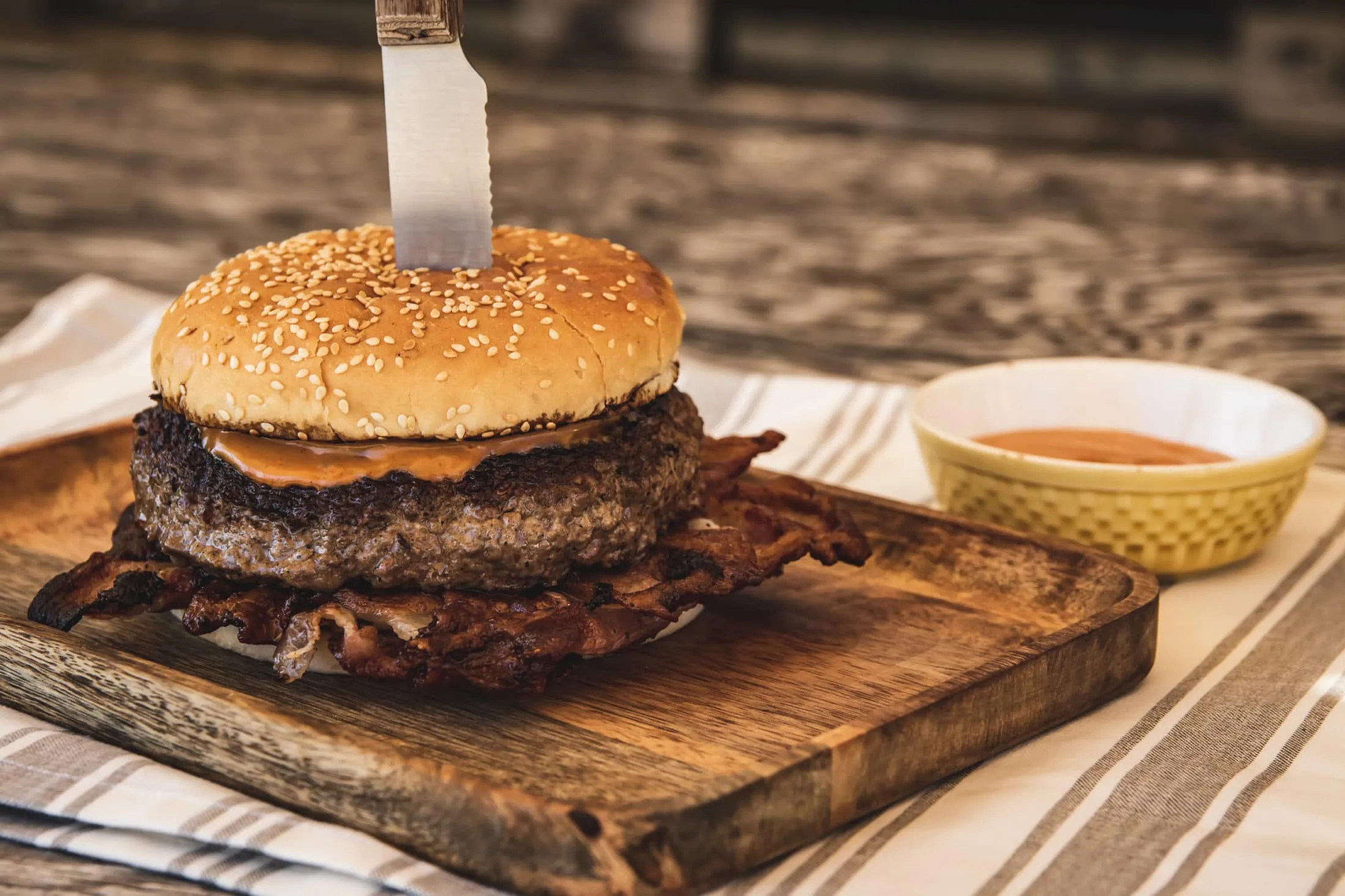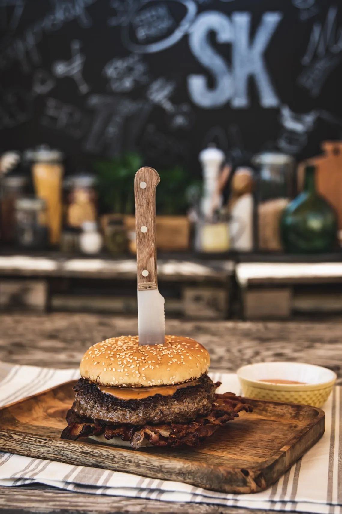 A pirult zsemle alját megkenjük a szósszal, erre kerül a baconfonat, majd a tuningolt húspogácsa. A zsemle tetejét is megkenjük a szósszal, és készen is vagyunk.