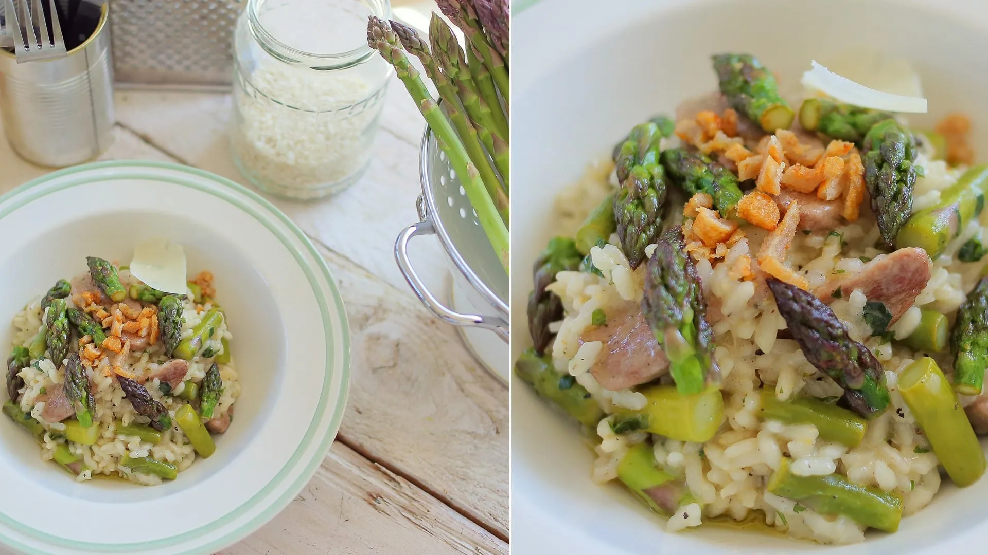 A második adag alaplé után hozzáadjuk a rizottóhoz a feldarabolt zöldspárga szárakat, a spárga fejét félretesszük. Folytatjuk a folyadék adagolását és a kevergetés, közben sózzuk, borsozzuk, belereszeljük egy citrom héját és hozzáadjuk fél citrom levét is. A végén beledobjuk a vajat és utoljára összeforgatjuk. Hozzáadjuk a kacsamellet és tálaláskor a spárga fejeket is, amiket előtte egy kevés vajon egy másik serpenyőben lepirítunk. Már csak a pörc hiányzik és néhány paremzán forgács, amit szintén rászórunk.