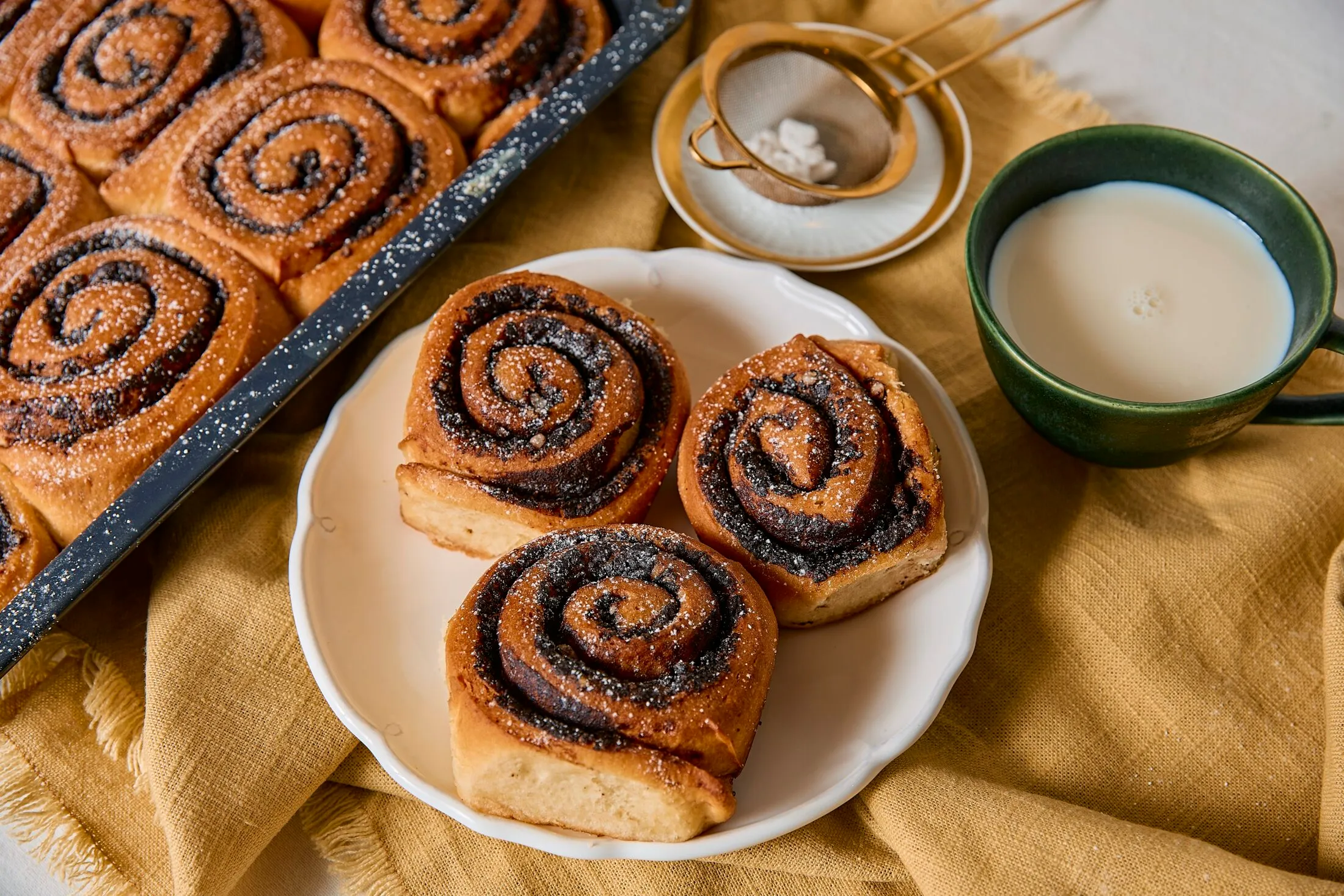 Berakjuk a tepsit a 180 fokra előmelegített sütőbe és alsó-felső sütési fokozaton 25 perc alatt készre sütjük a tekercseket. Ha szép pirosra sültek a csigák, meglocsoljuk a vaníliás-cukros tejjel és visszarakjuk még 2-3 percre a sütőbe. Pihentetjük 15-20 percet, és tálalásnál egy kevés porcukrot hintünk rá.