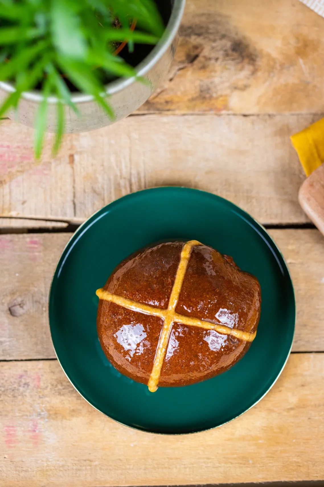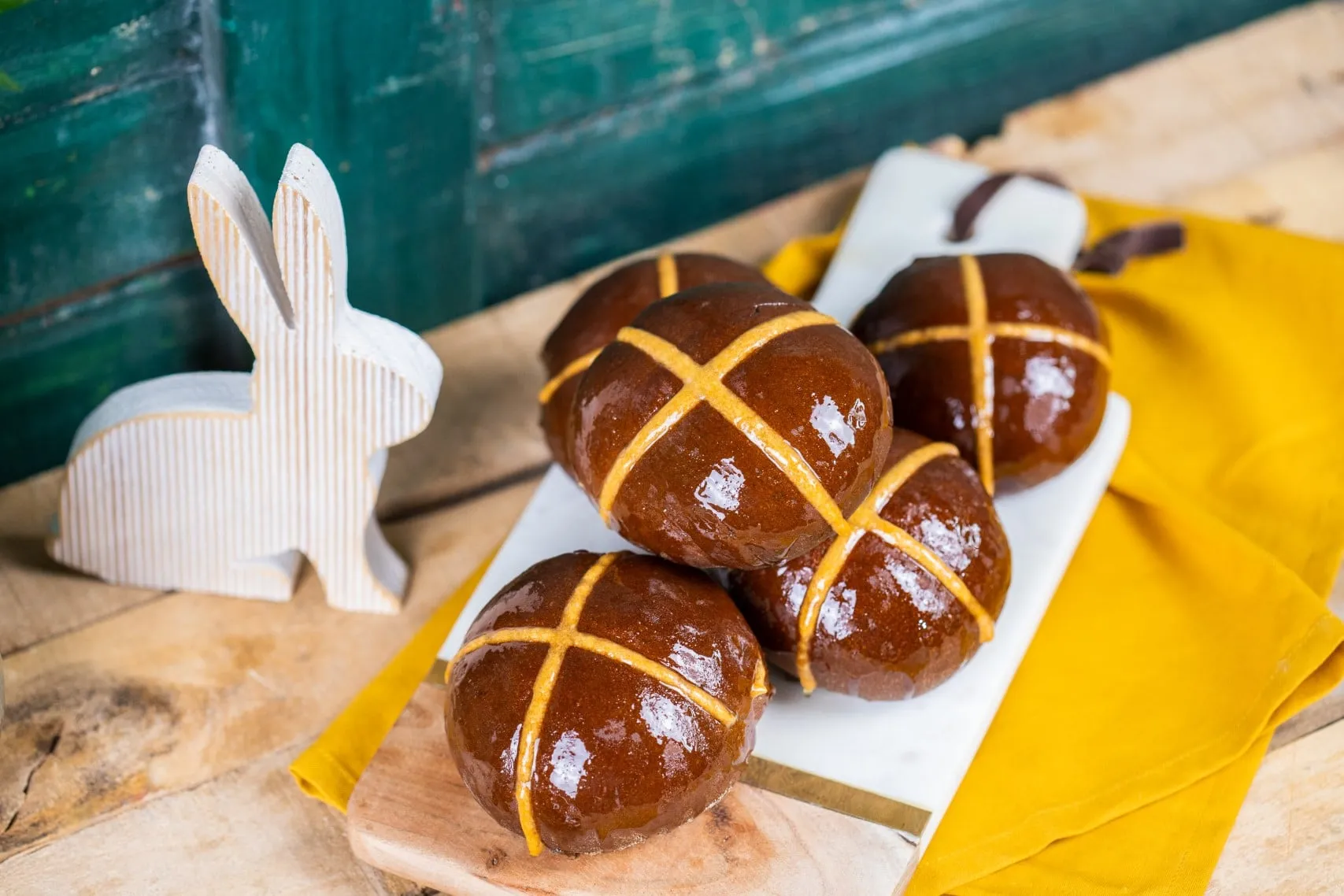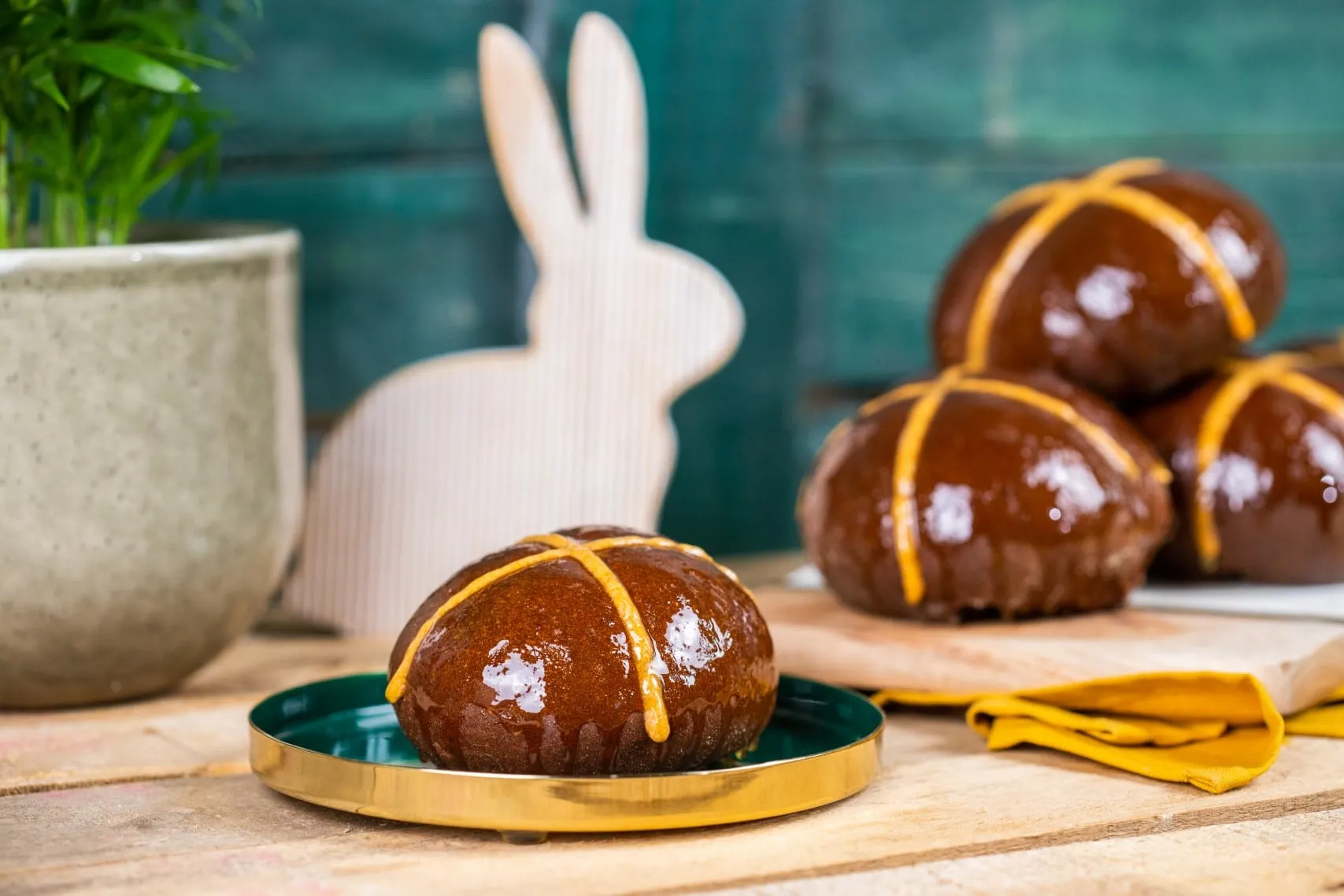 Közben elkészítjük a díszítést: összekeverjük a lisztet, az olajat és a vizet, nyomózsákba töltjük az így kapott masszát, majd kereszt alakban a bucik tetejére nyomjuk. Sütőpapíros tepsire tesszük, és 175 fokra előmelegített sütőbe toljuk a bucikat 30-35 percre. Mikor megsültek, még melegen lekenjük őket mézzel, hogy szép fényes legyen a felületük.