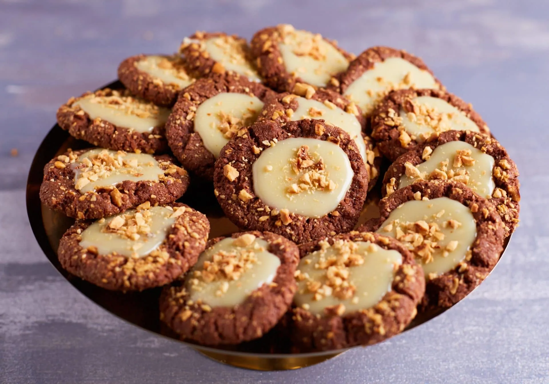 Mikor kihűltek a kekszek, a tejszínt jól felmelegítjük, leöntjük vele az apróra vágott fehér csokit, homogénné keverjük és belecsorgatunk kb. 1-1 teáskanálnyi adagot a kis mélyedésekbe a kekszek közepén. Megszórjuk őket a vágott mogyoróval, és bedobjuk a hűtőbe, hogy minél hamarabb megdermedjen a csoki.