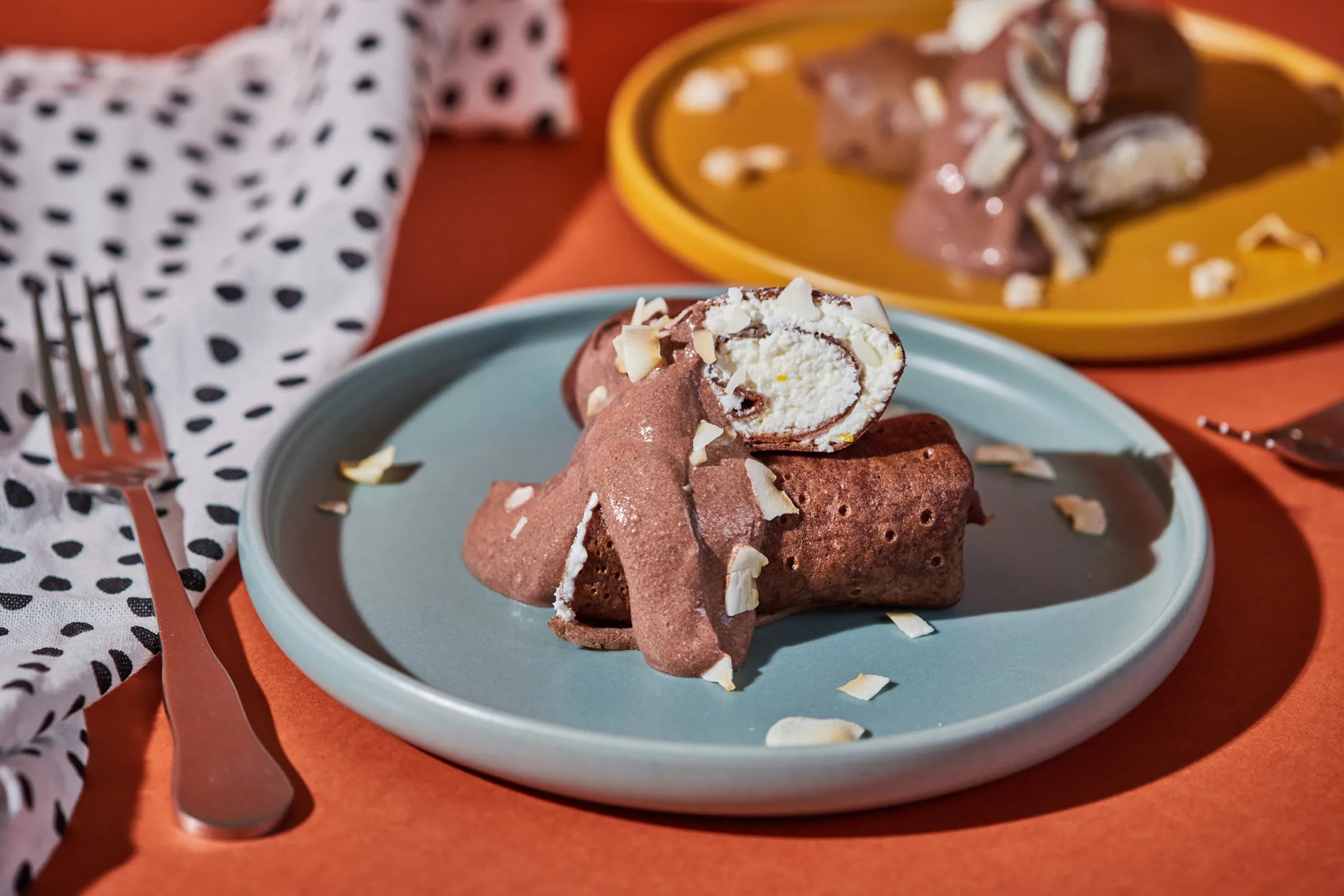 A töltelékhez a túrót, a tejfölt, a kókuszreszeléket, a porcukrot, a vaníliás cukrot és a citrom reszelt héját alaposan összekeverjük, és megtöltjük vele a palacsintákat. A kakaós tejfölhöz összekeverjük a tejfölt a kakaóporral és a cukorral, majd a palacsinták mellé kanalazzuk, végül az egészet megszórjuk kókuszchipsszel.