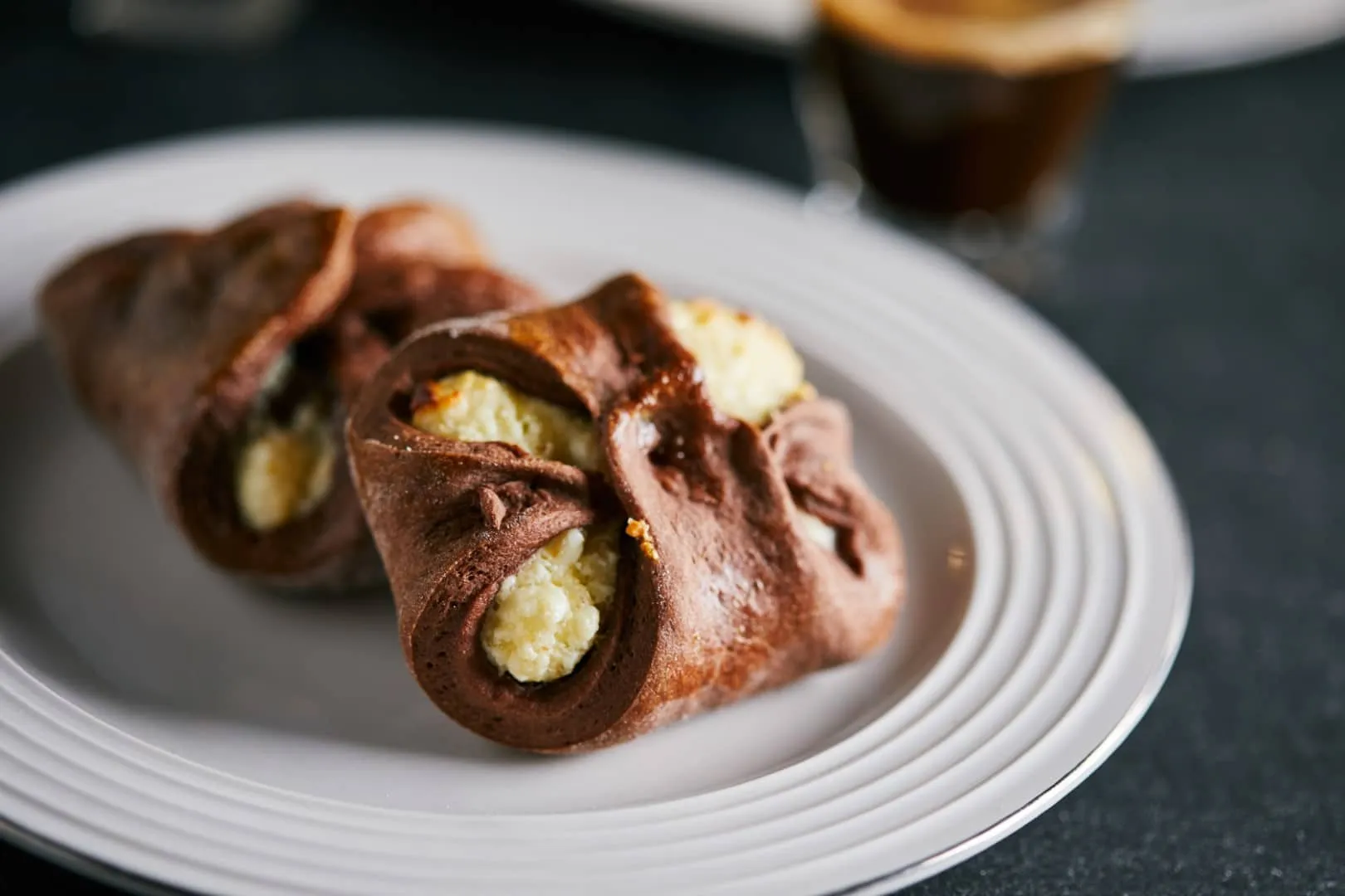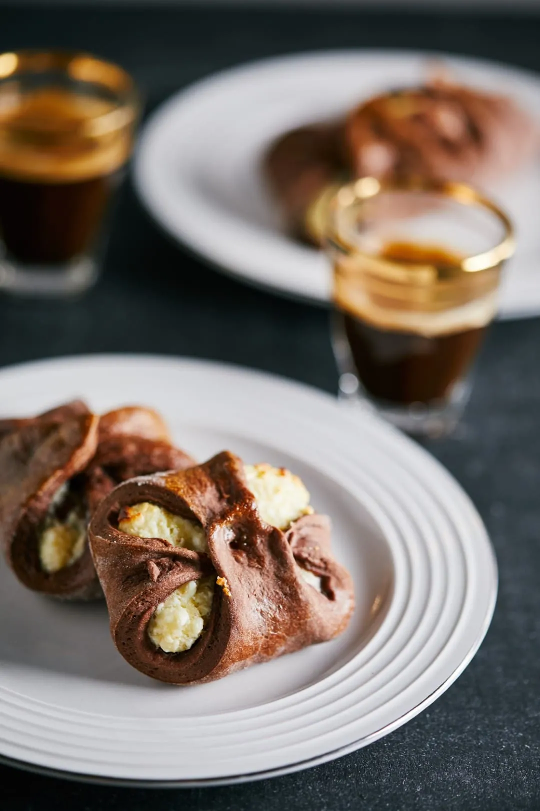 A tésztához a langyos tejbe belemorzsoljuk az élesztőt, beleszórjuk a cukrot, és pár percig hagyjuk pihenni, hogy felfusson. A kétféle lisztet elkeverjük a kakaóporral és a sóval, beleöntjük az élesztős tejet, hozzáadjuk a tojássárgáját, majd elkezdjük bedagasztani a tésztát. Mikor összeállt, hozzáadjuk az olvasztott vajat is, és simára dagasztjuk. Letakarva 40 percig kelesztjük.