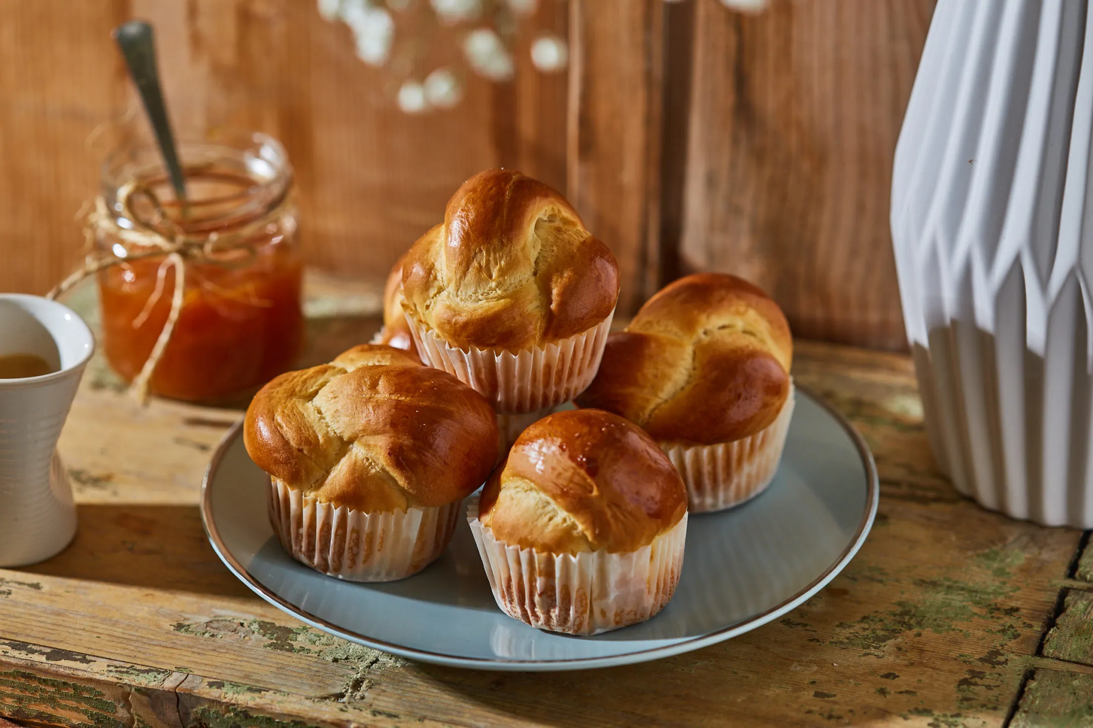 Ezután enyhén lisztezett deszkán átgyúrjuk, majd 12 egyenlő részre osztjuk. Egyenként elharmadoljuk a tésztákat, és 3 kis rudat sodrunk belőlük, mintha kalácsot készítenénk. Befonjuk őket, a két végét aláhajtjuk, és papírral kibélelt muffinsütő formába tesszük, lefedjük, és 15 percig meleg helyen hagyjuk kelni.