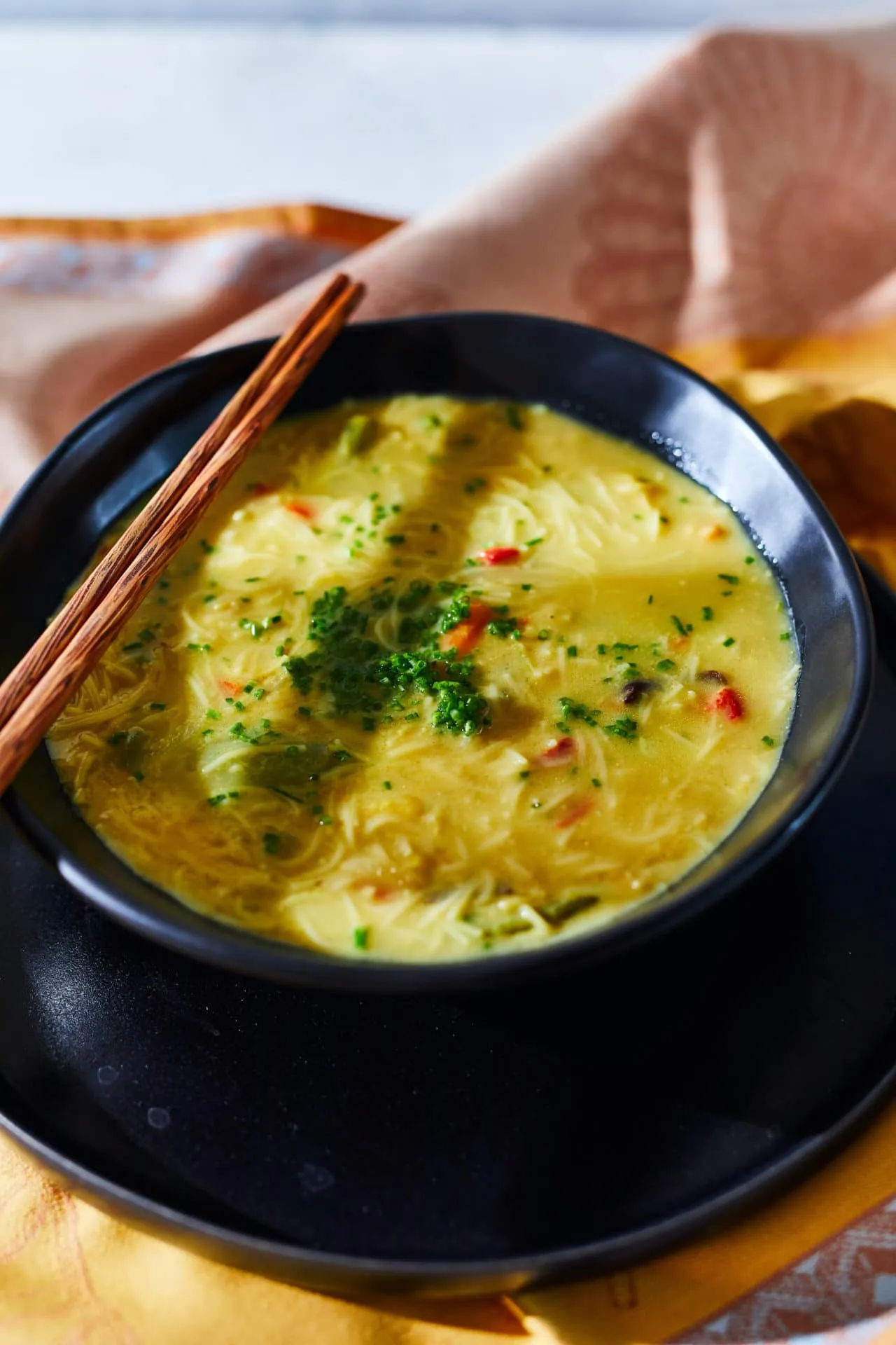 A hagymát félfőre vágjuk, majd felszeleteljük, a chilit,gyömbért és a fokhagymát pedig nagyon apróra vágjuk. Lepirítjuk őket az olajon, majd hozzáadjuk a koriandert, a római köményt, a curryt, és további 1-2 percig együtt pirítjuk. Rátesszük a kókusztejet, felforraljuk, és jöhet rá a víz a csirkealaplé-zselével és a cukor. Felforraljuk, majd belerakjuk az ázsiai zöldségkeveréket, ízlés szerint sózzuk, borsozzuk, és belereszeljük egy citrom héját. Addig főzzük, amíg a zöldségek meg nem főttek, majd beletesszük a cérnametéltet, és 1-2 perc főzés után elzárjuk a lángot. Citromlével ízesítjük, megszórjuk aprított snidlinggel, és fogyasztjuk.