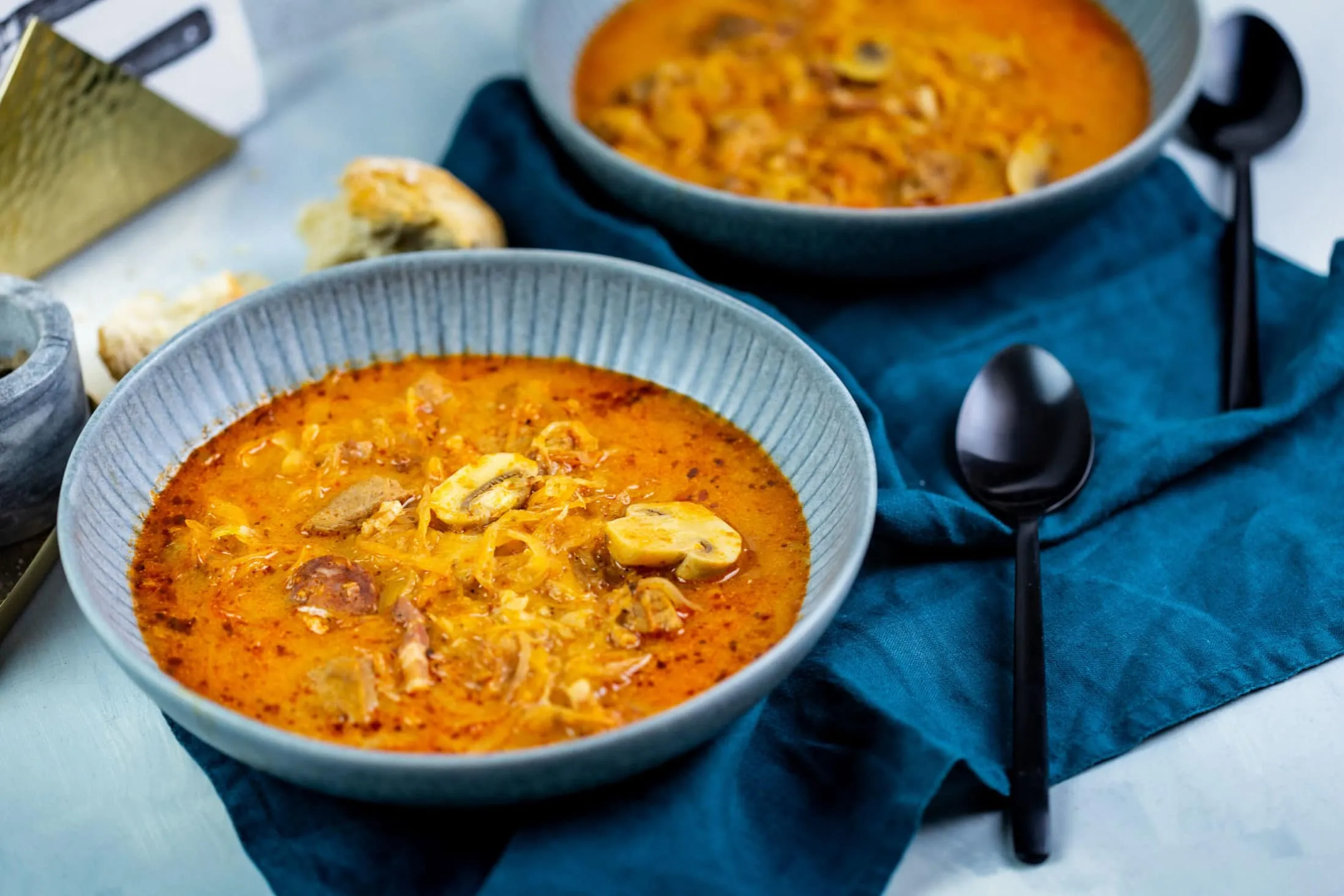Hozzáadjuk a káposztát, amit mindenki szájíze szerint mosson át, vagy sem. Felkarikázzuk a kolbászt, és szintén az alaphoz adjuk, majd összeforgatjuk, beleszórjuk a felszeletelt gombát, és felöntjük annyi vízzel, hogy leves sűrűségű legyen (nálunk ez másfél liter volt). Ha van házi alaplevünk, azt is használhatjuk, de ha vízzel öntjük fel, rakunk bele egy alaplézselét. A húst puhulásáig főzzük, nagyjából még további 20 percet, majd hőkiegyenlítéssel behabarjuk, azaz a tejfölt csomómentesre keverjük a liszttel és némi forró főzőlével, mielőtt a levesbe öntenénk. Forralunk rajta egyet, és kész is.