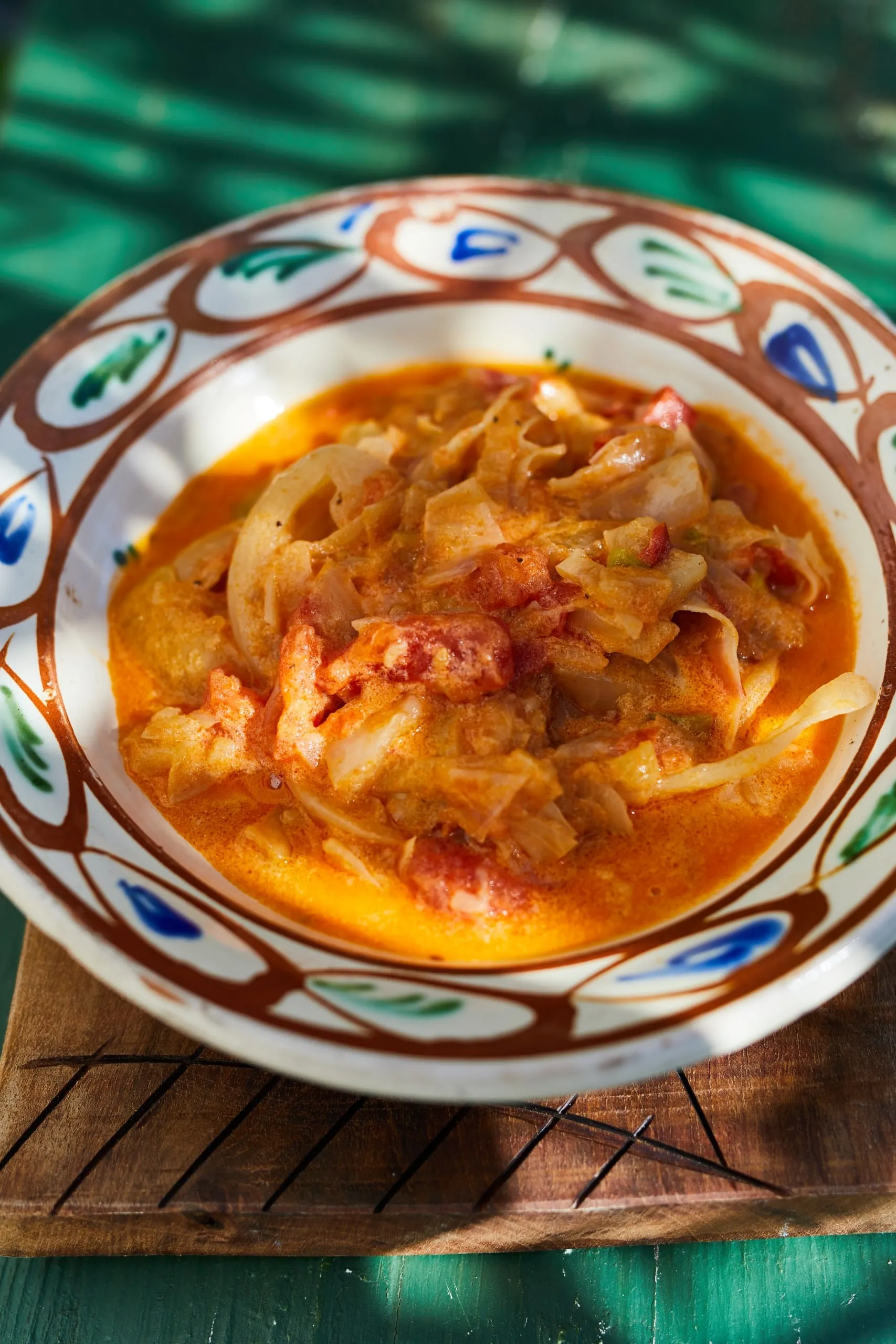 A felszeletelt hagymát, káposztát, kétféle paprikát és fokhagymát a lehető legmagasabb hőmérsékleten lepirítjuk a zsíron, sózzuk, borsozzuk. Amikor már kicsit kezdenek összeesni, hozzárakjuk a szeletelt paradicsomot, és ha szükséges, kevés vizet öntünk rá (ha esetleg nem elég lédús a paradicsomunk). Addig főzzük, amíg meg nem főttek a zöldségek és össze nem rottyant az egész.