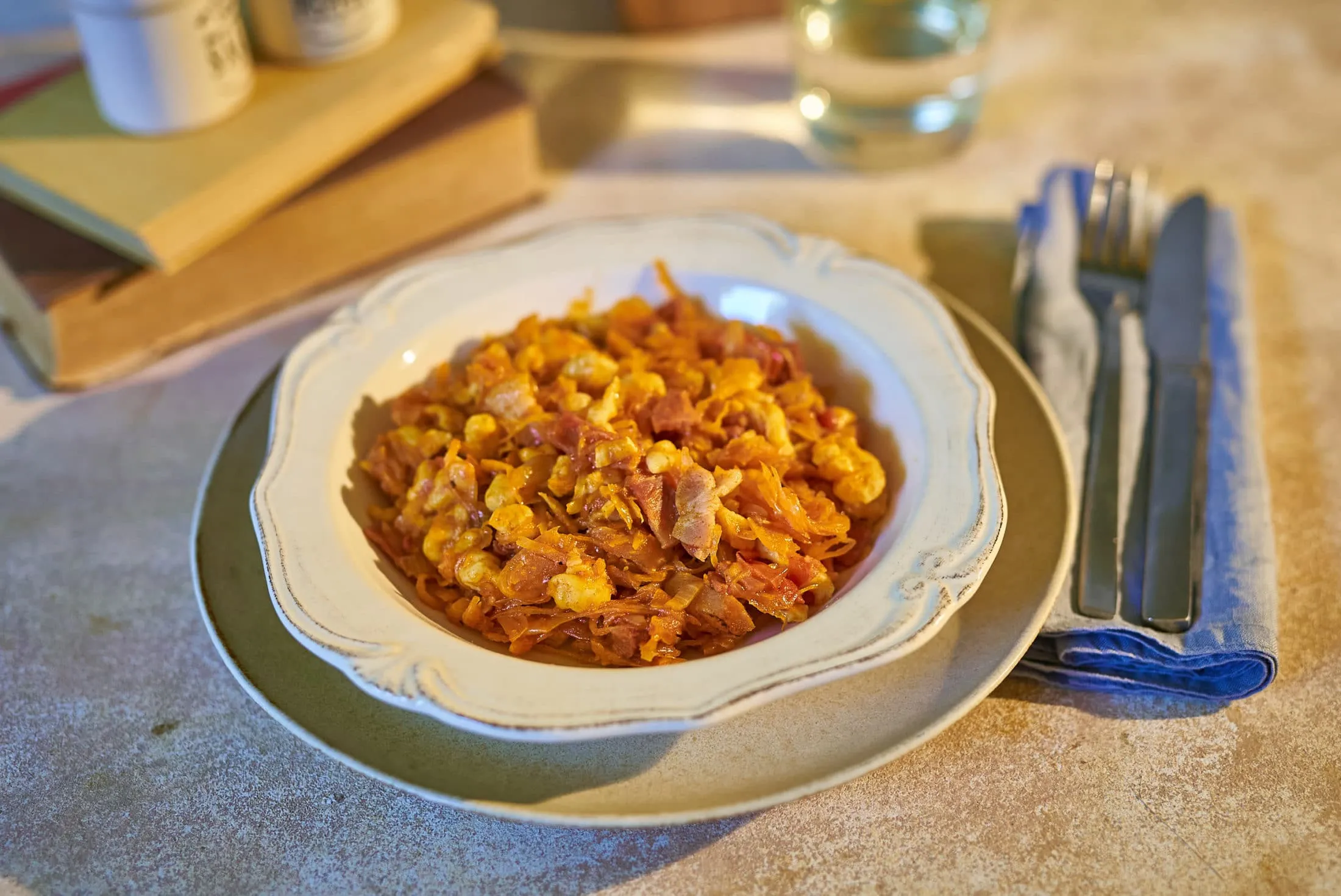 Egy nagy lábasban vizet forralunk, megsózzuk, közben bekeverjük a nokedlitésztát, és ha felforrt a víz, nokedliszaggatóval beleszaggatjuk a tésztánkat. 1 perc főzés után leszűrjük, és hozzákeverjük a káposztás alaphoz. Egyet forralunk rajta, és már kész is vagyunk.