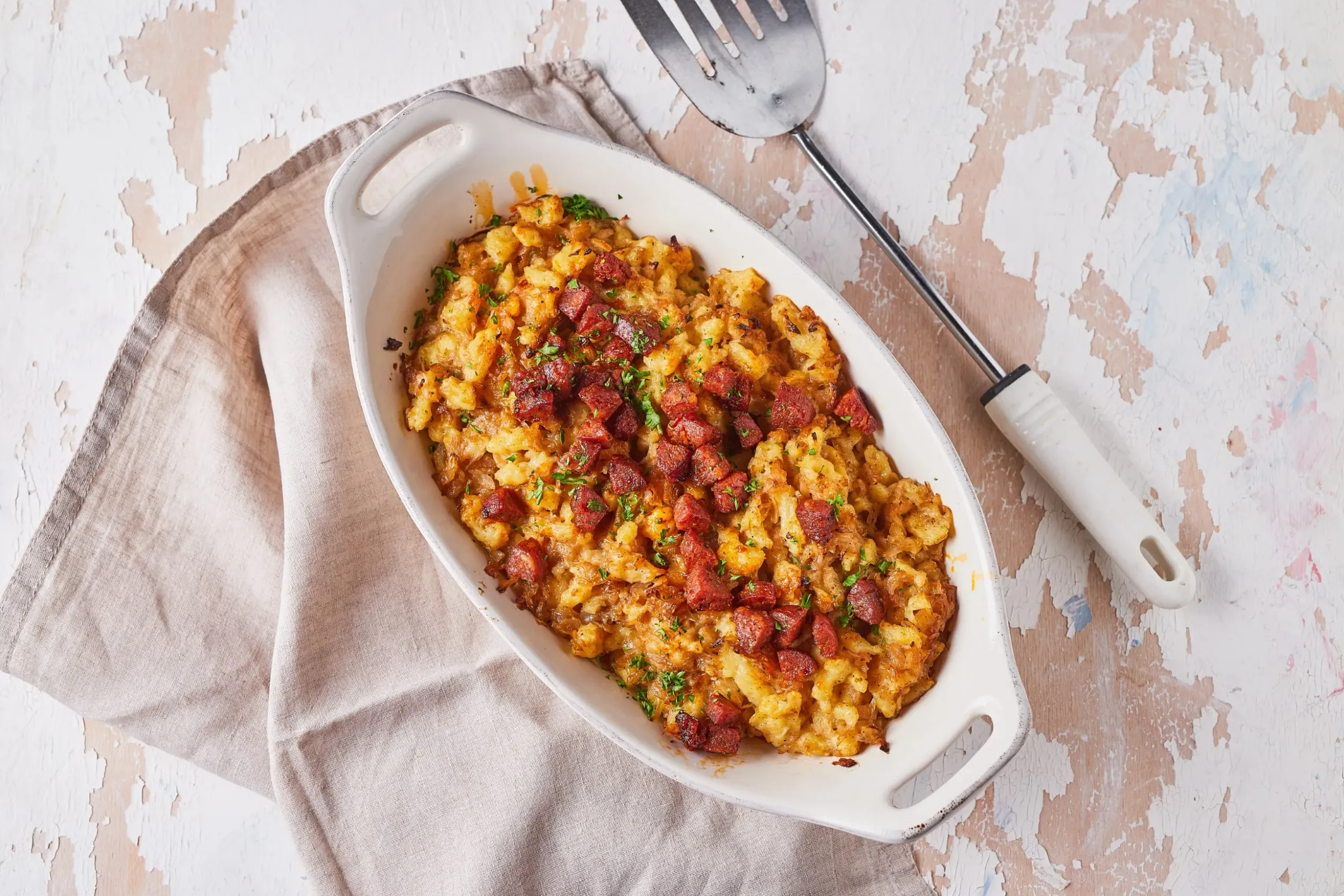Egy lábasban sós vizet forralunk. A sztrapacska tésztájához a megtisztított krumplit kis lyukú reszelőn lereszeljük, összekeverjük a tojással, sózzuk, borsozzuk, és alaposan összedolgozzuk a liszttel.