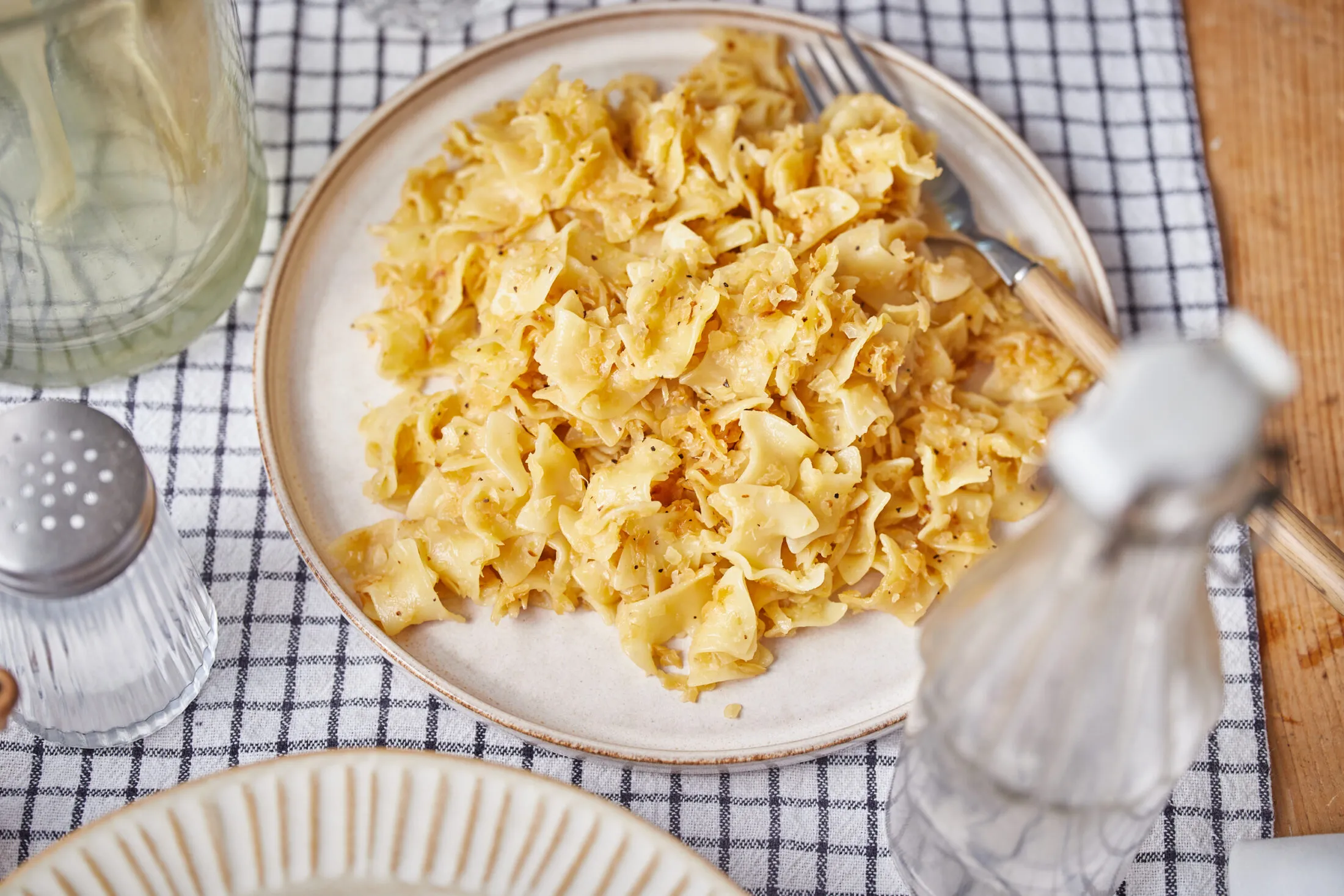 A tésztát bő sós forró vízben kifőzzük, ráöntjük a pirított káposztára, és alaposan összeforgatjuk.