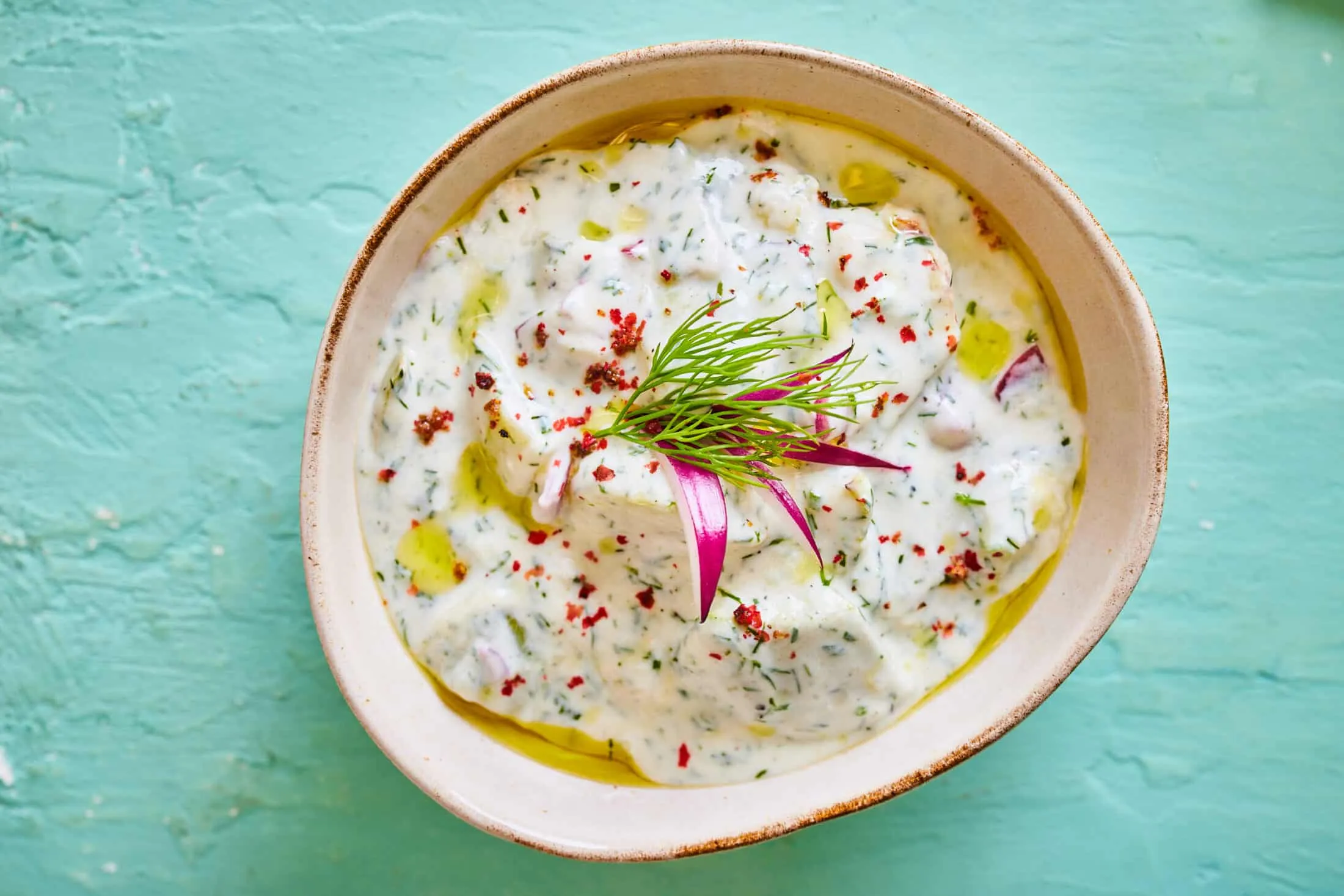 A kész salátát egy tányérba kanalazzuk, meglocsoljuk olívaolajjal, és friss kaporlevelekkel díszítjük.