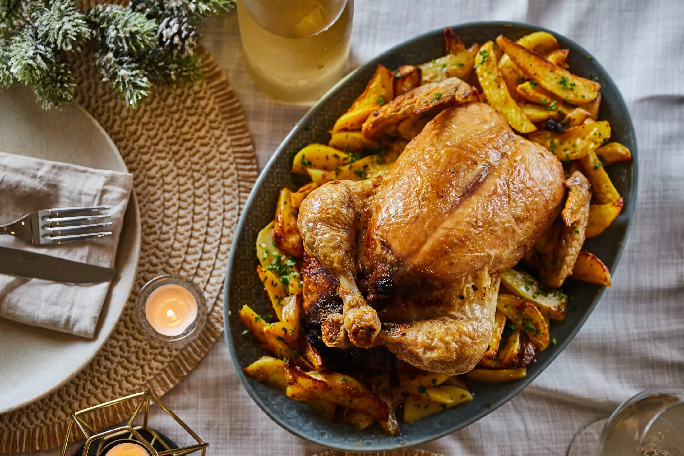 Végezetül óvatosan, a gerinccsont mentén átvágjuk a csirkét, és részekre szedve tálaljuk a sült burgonyával.