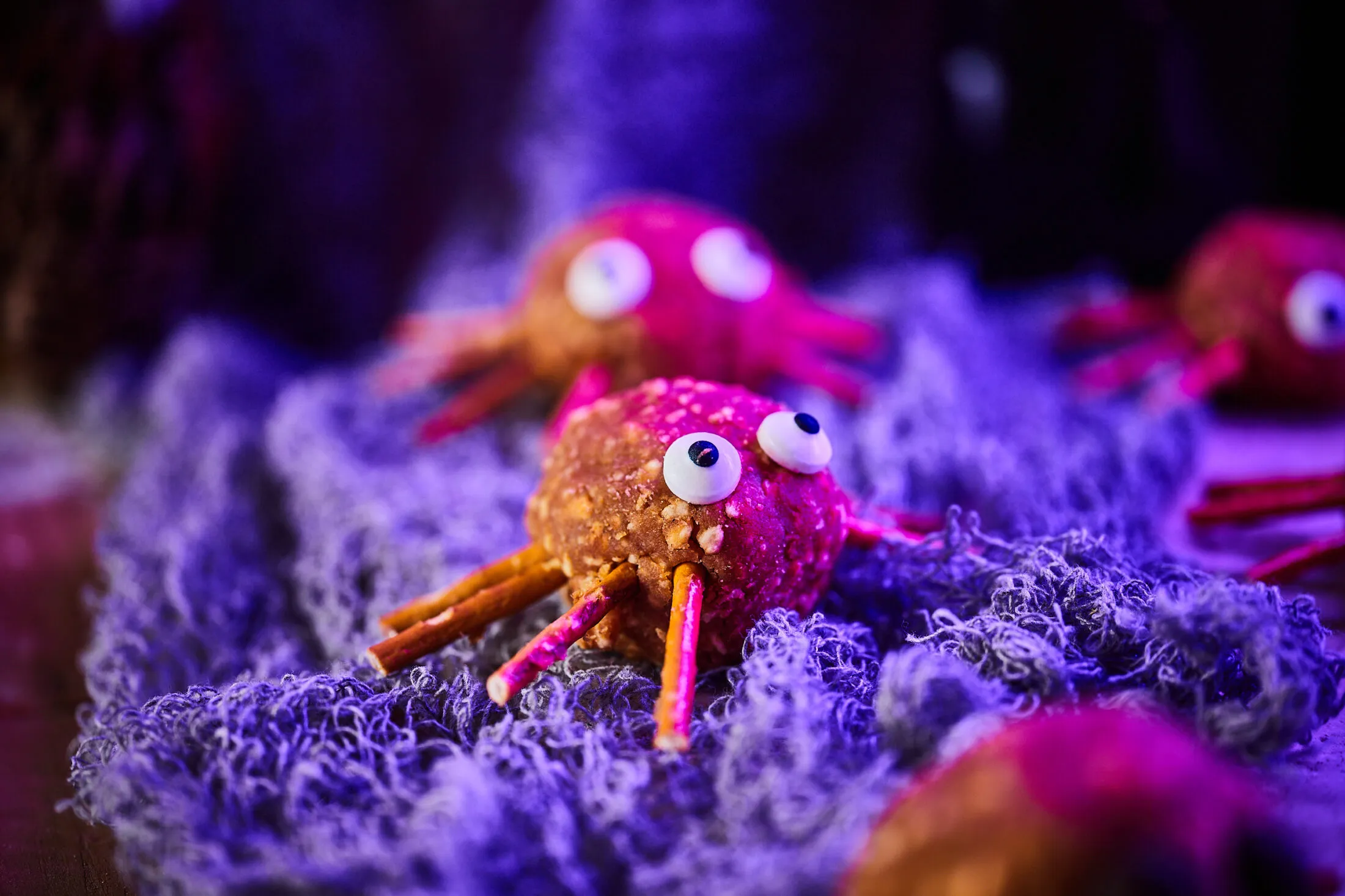 A ropikat háromba törjük és beleszúrjuk a gombócokba (ha nem vagytok jóban a biosszal, akkor segítek: a póknak 8 lába van), aztán mehetnek rá a szemek és a csokipasztillák. Ha esetleg a szemek nem tapadnak jól, ujjal kicsit vizezzük be a perecgolyókat azon a helyen, ahova kerülnének a látószervek. A kész perecpókokat érdemes 20 percet pihentetni a hűtőben, mielőtt tálalnánk, hogy összeérjenek az ízek. Boldog halloweent mindenkinek!