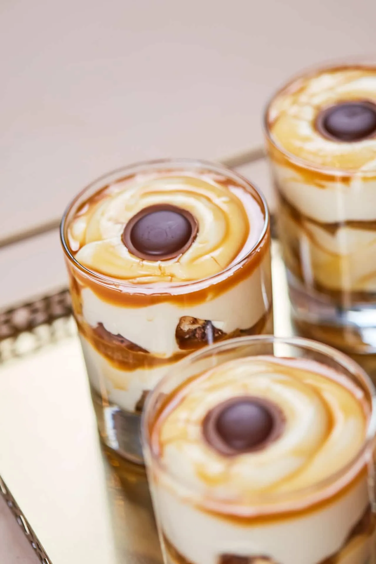 Előveszünk 4 db poharat. A babapiskótákat kisebb darabokra törjük, beáztatjuk a kávéba, és egymásra rétegezzük a krémmel, a Toffifee-darabokkal és a karamellöntettel. A tetejükre rakunk 1-1 szem Toffifeet és egy kevés karamellöntetet.