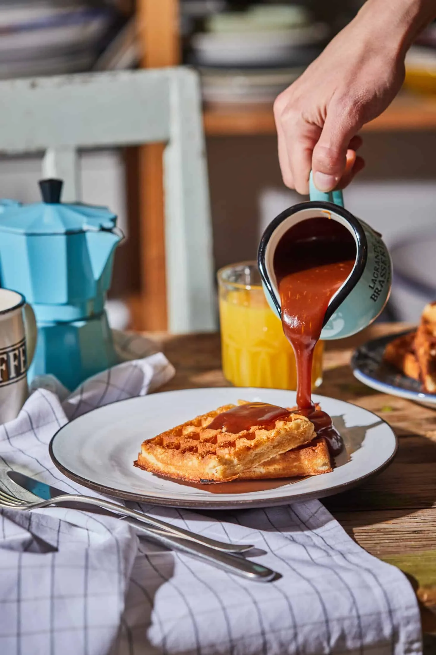 A karamellszószhoz először a cukrot a vízzel egy gyorsforralóba tesszük és közepes lángon hagyjuk, hogy megkaramellizálódjon. Ne keverjünk bele, a víz segít, hogy ne csomósodjon össze. Ezután lehúzzuk a tűzről és 2-3 részletben hozzáadjuk a tejszínt, közben egy habverővel kevergetjük.