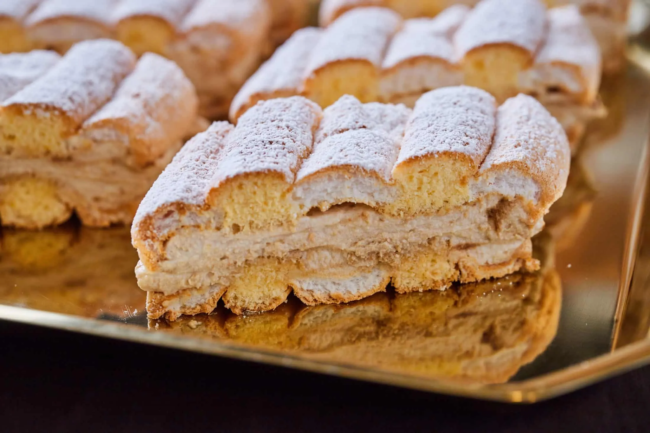 A tepsit 180 fokra előmelegített sütőbe toljuk, és megsütjük benne a két lapot 18-20 perc alatt. Ezután megvárjuk, amíg kihűl, legjobb, ha kitámasztott sütőajtónál tesszük, különben könnyen összeesik a tészta. Amikor kihűlt, óvatosan lehúzzuk a sütőpapírt, és az egyiket lefektetjük egy deszkára vagy tálra. A tejszínt elkezdjük felverni, és mikor félkemény állapotban van, hozzákeverjük az előzőleg egy kis tálban elkevert habfixálót, kávét és porcukrot, majd kemény, tejszínhab állagúvá keverjük a habot. Ezt betöltjük a két lap közé, és ha szépen szeletelhető sütit szeretnénk, 2-3 órát hűtőben pihentetjük. Ajánlatos nagyon éles vagy kenyérvágó késsel vágni. Tálaláskor ízlés szerint megszórjuk porcukorral.