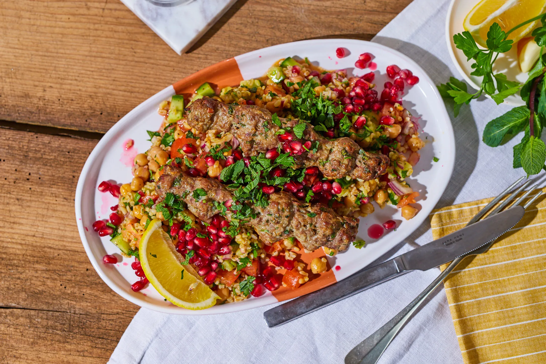 A gránátalma magjait kinyerjük, ehhez előtte néhányszor átgörgetjük a gyümölcsöt kemény felületen, majd félbevágjuk, és kiütögetjük a magokat. Ha teljesen lehűlt a bulgur, hozzáadjuk a zöldségkeverékhez, mehet bele a konzerv csicseriborsó és a gránátalma is, végül összekeverjük az egészet a dresszinggel. Kivesszük a kebabot a sütőből, és a bulgursalival tálaljuk, megszórhatjuk még egy kis zöldfűszerrel, gránátalmamagokkal és egy cikk citrommal kínáljuk.