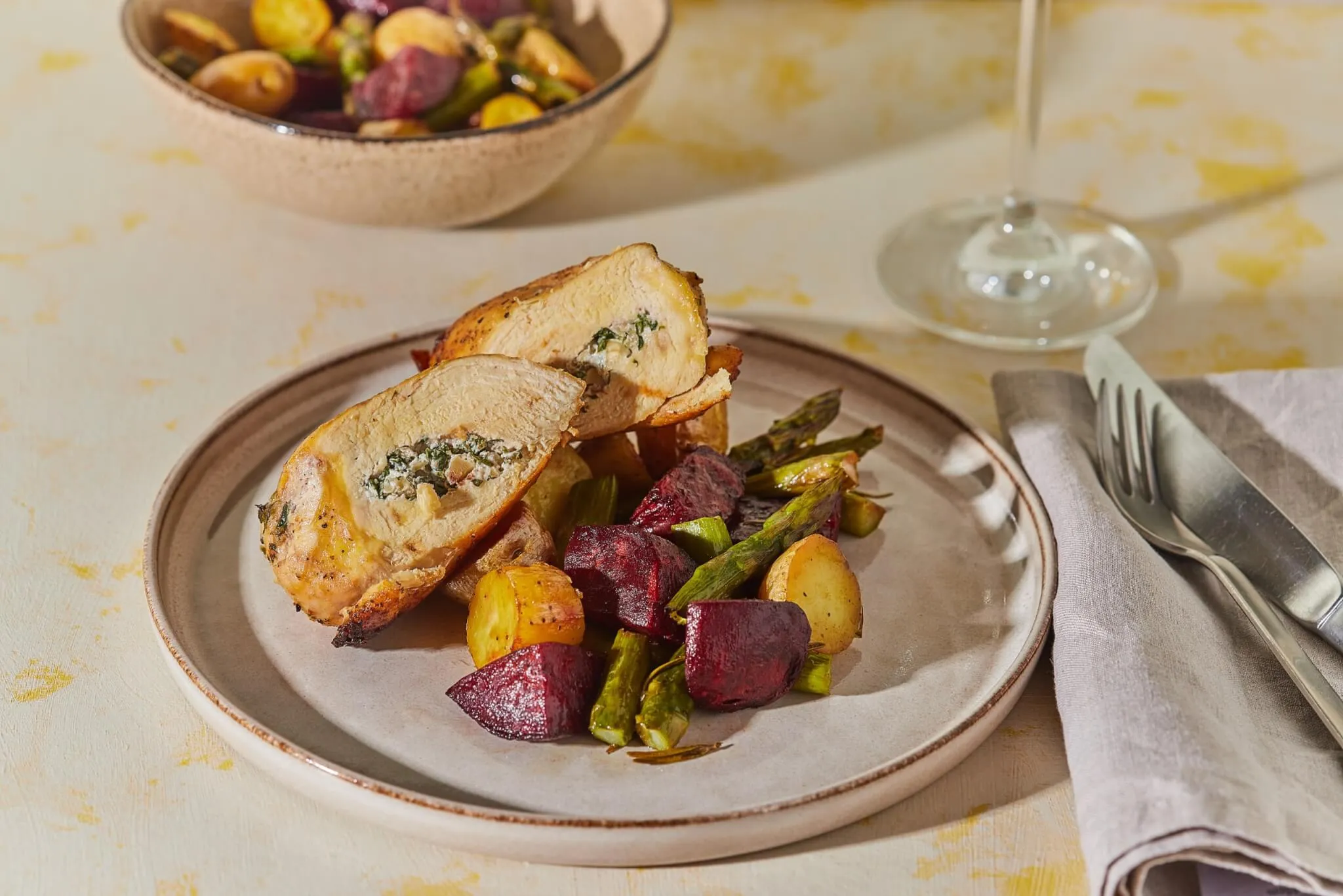 Először a kecskesajttal töltött csirkemell köretét készítjük el. Az újkrumplit nem kell meghámozni, bőven elég alaposan megmosni, és átdörzsölni egy tiszta mosogatószivaccsal. Félbe- vagy háromba vágjuk, és mehet is egy kisebb tepsibe. A céklát meghámozzuk, és a krumplihoz hasonló nagyságúra vágjuk, majd hozzádobjuk a tepsibe. Olívaolajjal meglocsoljuk, sózzuk, borsozzuk, majd hozzáadjuk a rozmaring letépkedett leveleit, átforgatjuk, és mehet a 180 fokra előmelegített, hőlégkeveréses sütőbe 20 percre.