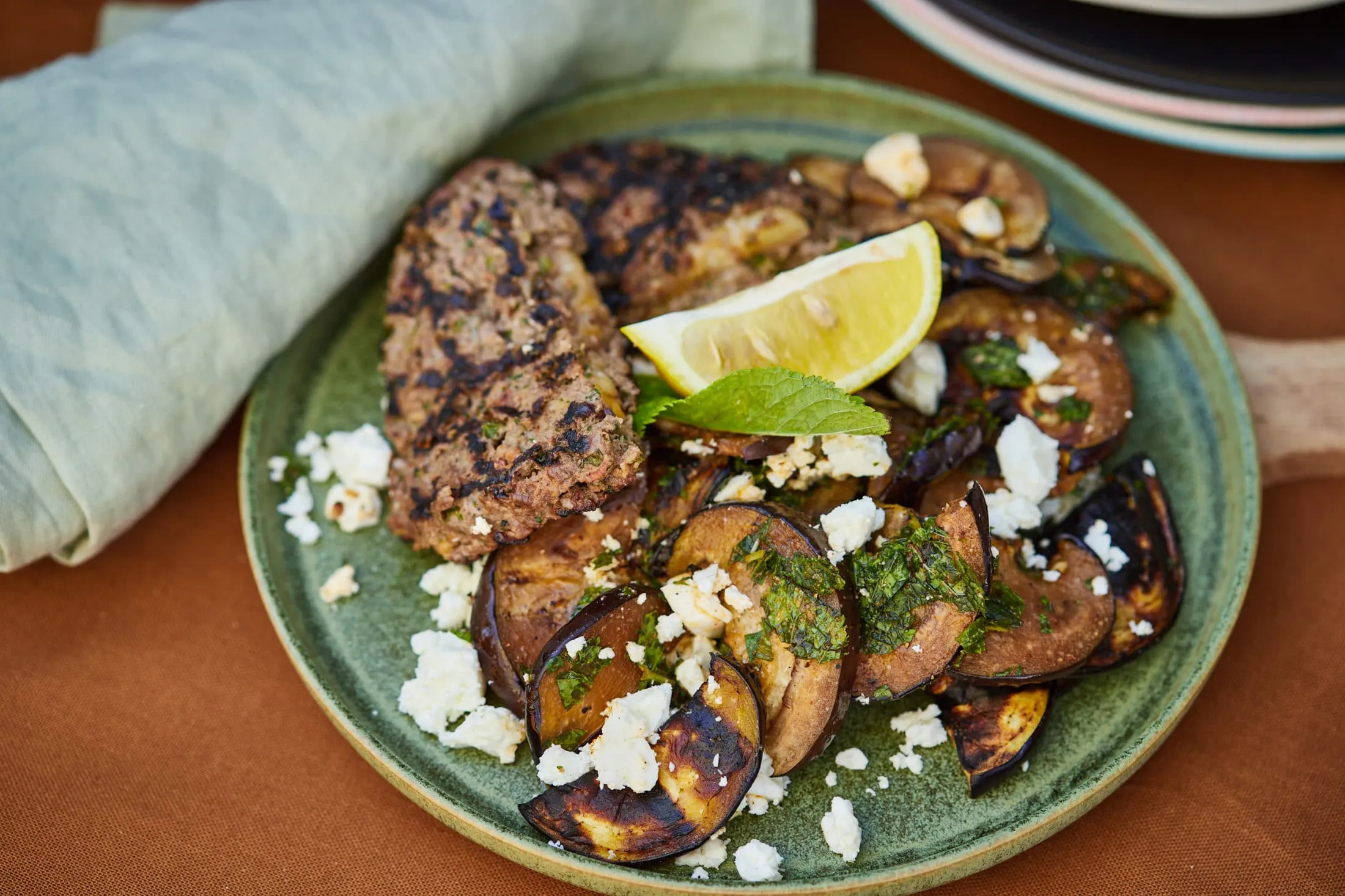 A sajtal töltött húspogácsákat szintén a grillre dobjuk, és oldalanként 2-3 perc alatt megsütjük. A sült húst a padlizsánsalátával és egy cikk citrommal, valamint néhány levél friss mentával tálaljuk.