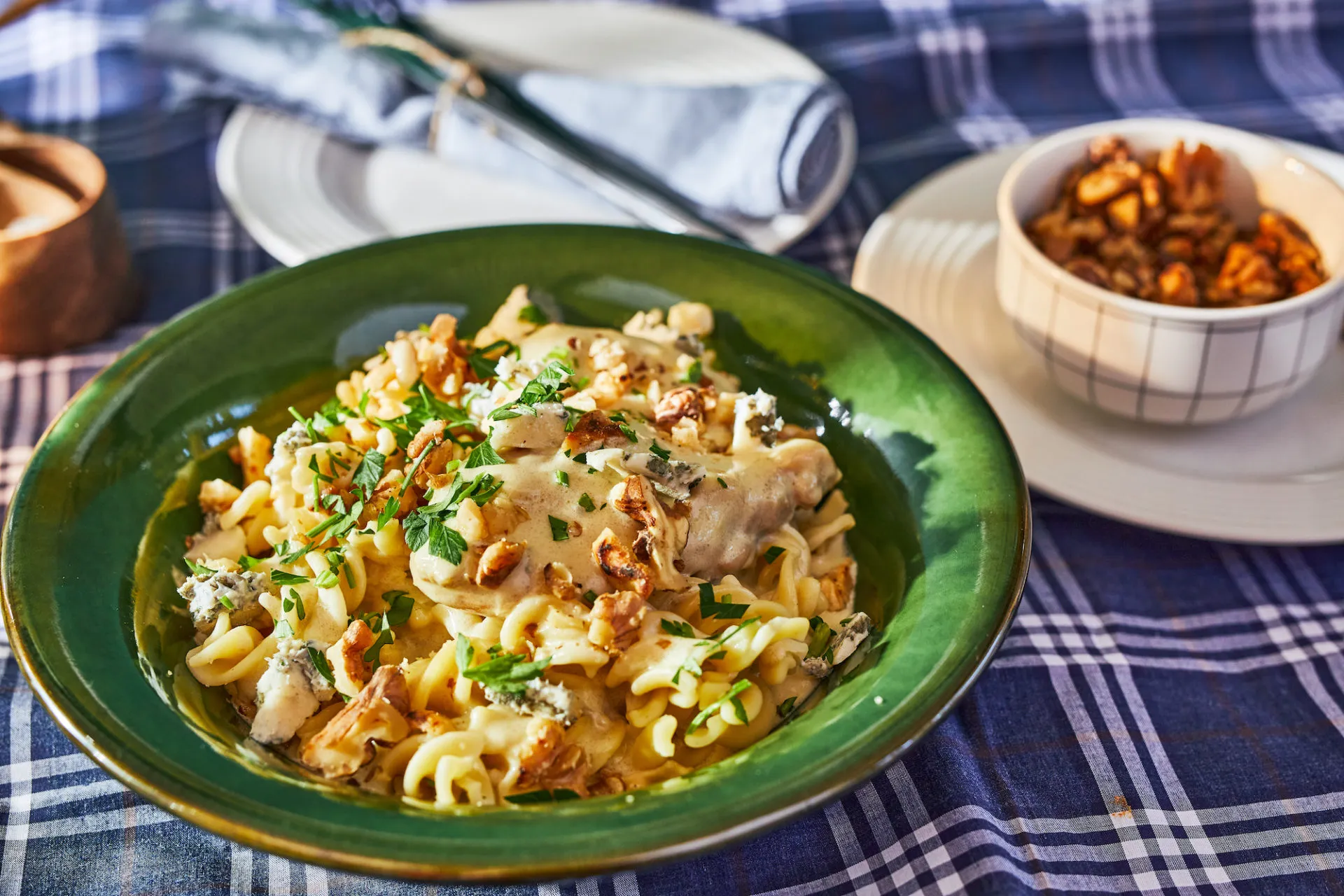 A tésztát a csomagoláson feltüntetett módon megfőzzük, majd leszűrjük, és tányérba szedjük. Rákanalazzuk a ragut, megszórjuk az aprított dióval és a frissen vágott petrezselyemmel.