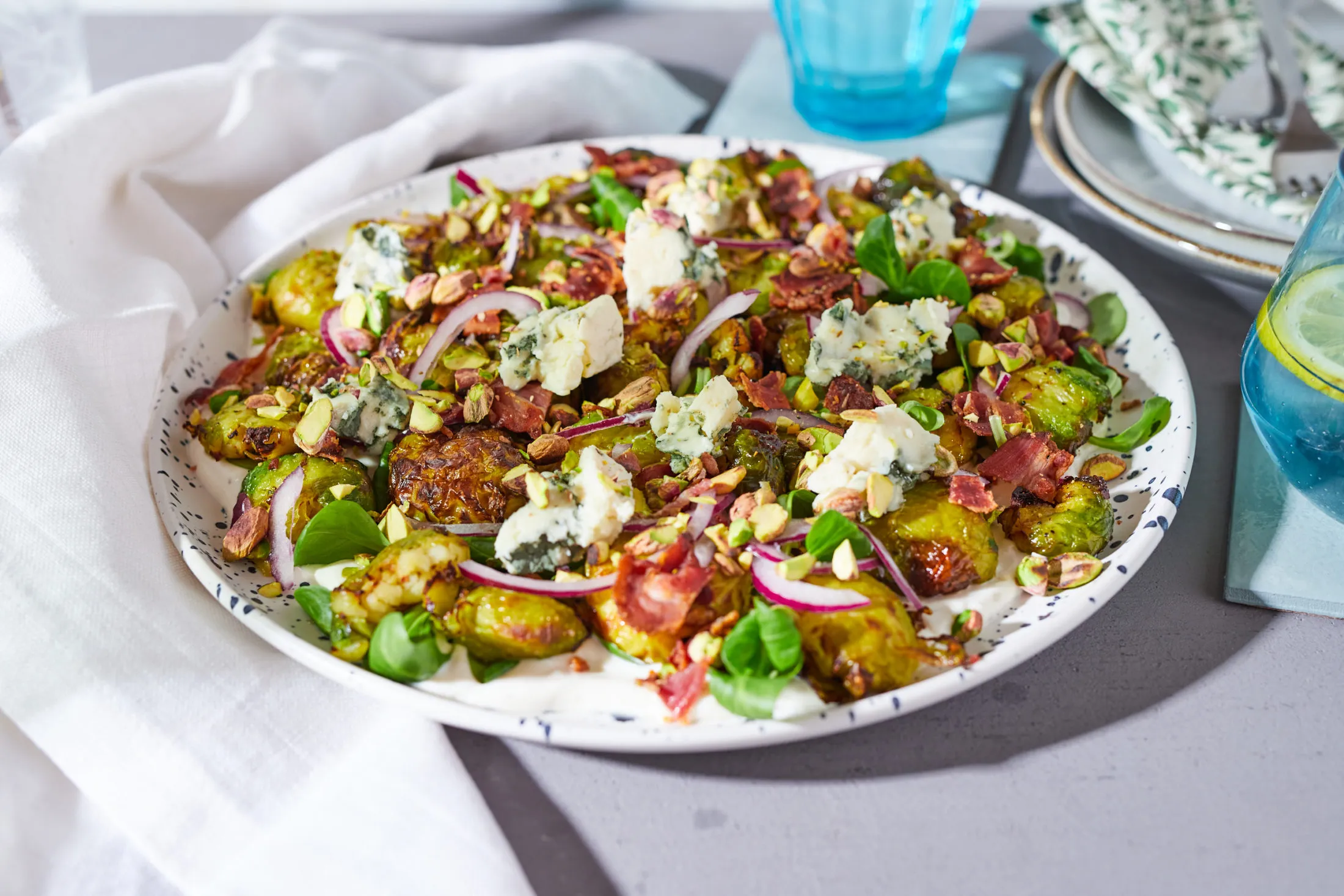 A kencéhez a zúzott fokhagymát egy tálban összekeverjük a többi hozzávalóval. Összerakjuk a salátát: a tányér aljára mehet a kence, rá a madársali, a sült kelbimbó, a vékonyan felszeletelt lila hagyma, a felaprított bacon, a kéksajt, végül a pisztácia, és kész is vagyunk.