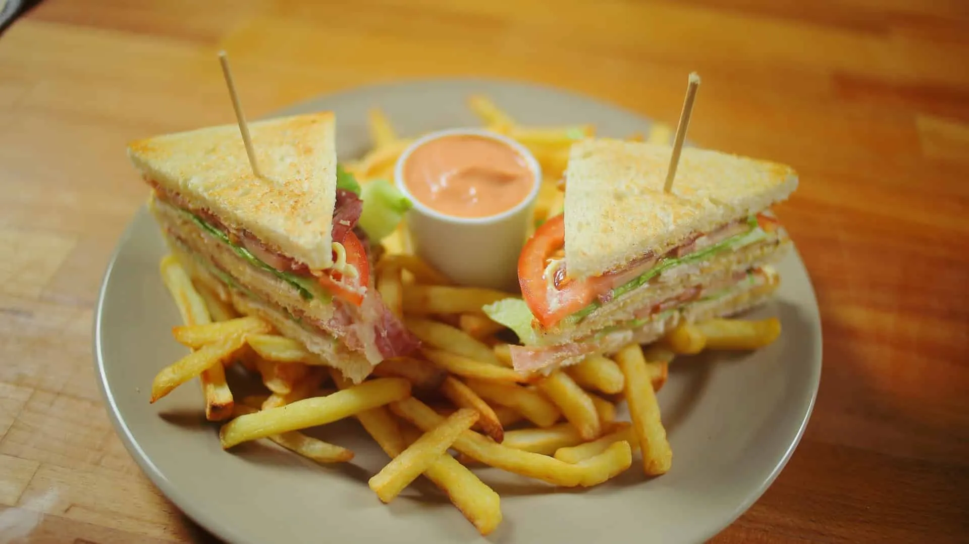 Közben a csirkemellet sózzuk, borsozzuk és frissen reszelt szerecsendióval ízesítjük, majd egy evőkanálnyi olajjal lelocsoljuk és átforgatjuk. Egy forró serpenyőbe öntünk 3 evőkanál olajat és beledobjuk a fűszerezett csirkemellet. Gyorsan aranyszínűre pirítjuk mindkét felét, levesszük a tűzről és mellé dobunk egy friss rozmaringágat és egy jó darab vajat. Az olvadt vajjal meglocsolgatjuk a csirkemellet, majd az egészet serpenyőstül a sütőbe helyezzük a piruló bacon mellé, ahol kb. 10 perc alatt tökéletesre sül. A bacont és a csirkét is kivesszük a sütőből, és hagyjuk kicsit kihűlni. Közben előkészítjük a kenyeret a szendvics összeállításához: a kenyerek héját levágjuk és a szeleteket száraz serpenyőben mindkét felükön enyhén megpirítjuk. Személyenként 3 szelettel készülünk, amiből kettőt gazdagon megkenünk majonézzel, majd ezekre a szeletekre pakolunk a vékonyra vágott csirkemellből, a nagyobb darabokra tépkedett jégsalátából, a vékonyra szelt paradicsomból és a ropogós baconből is. A két megpakolt szendvics-rész tetejére jön még egy kis majonéz, végül pedig az összeszerelés: az egyik szendvicsrész tetejére ráültetjük a másikat, amit pedig lefedünk az üresen hagyott pirított kenyérszelettel. Kicsit lenyomkodjuk, átlósan félbe vágjuk és egy-egy hurkapálcával rögzítjük. Fele-fele arányban ketchupot és majonézt keverünk össze és ezzel a szósszal és jó sok sült krumplival tálaljuk a szendvicsünket!