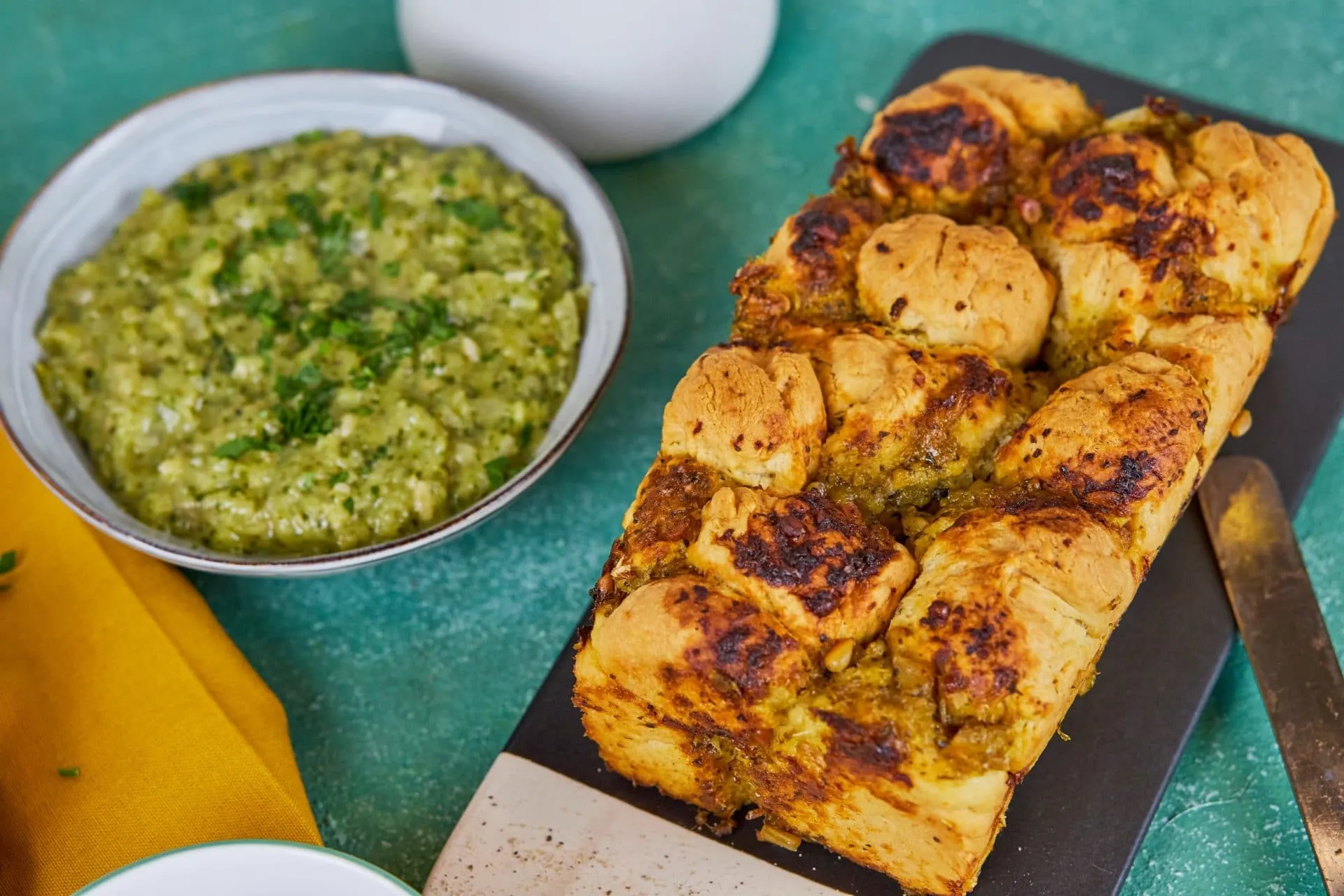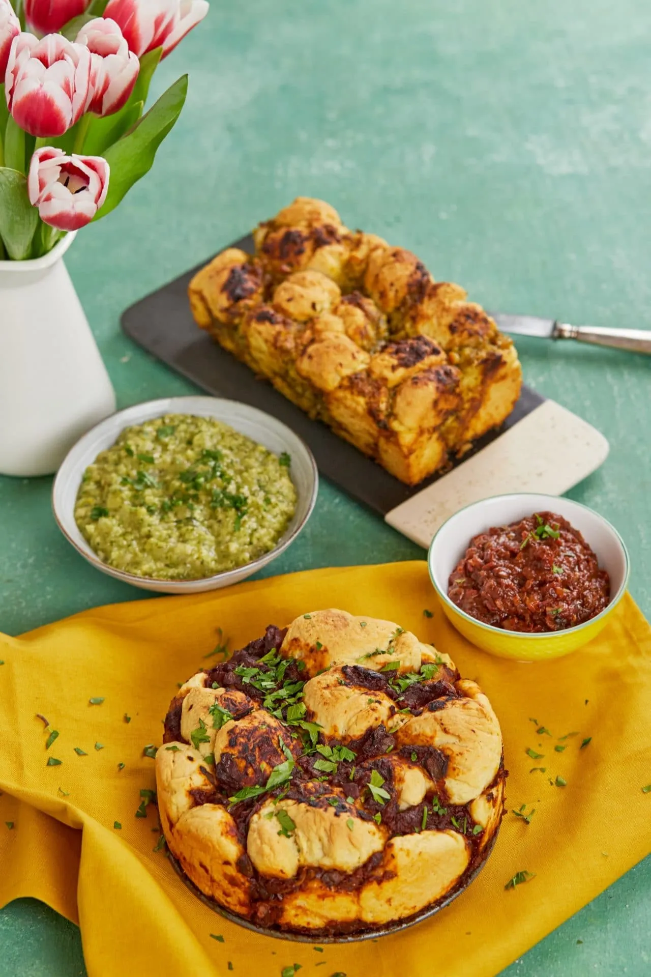 A tésztagombócok kilátszó tetejeit lekenjük egy kis olvasztott margarinnal, majd további 15 percig kelesztjük. Végül 180 fokra előmelegített, légkeverés nélküli sütőbe toljuk, és kb. 50-55 percig sütjük. Amikor a teteje szép pirosra sült, kitöltünk egy pohár száraz vörösbort, és összekóstoljuk vele a művünket!