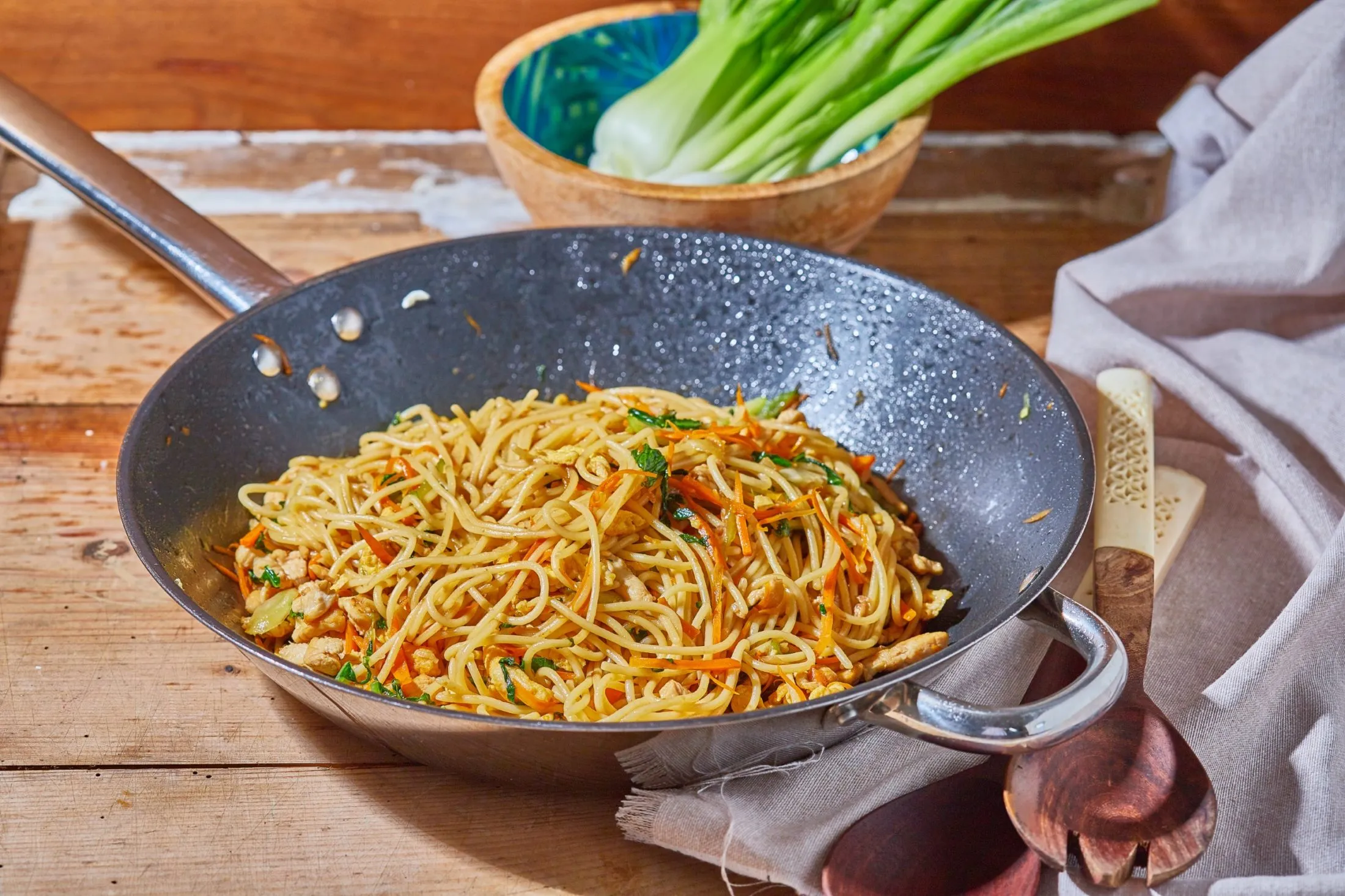 A forró wokban 2 ek olívaolajat melegítünk, és beledobjuk a csirkemellet. Amikor kicsit fehéredik a hús, hozzáadjuk az újhagymát, és 1-2 perc után a répát és a pak choi-t is. Közepes fokozaton összepirítjuk őket, majd beletesszük a tésztát, a világos szójaszószt, az osztrigaszószt és 1 tk sót szórunk bele, majd salátakeverővel lazán összekeverjük a wok tartalmát. Ha kaptok sötét szójaszószt, azzal erősebben be lehet színezni a tésztát.