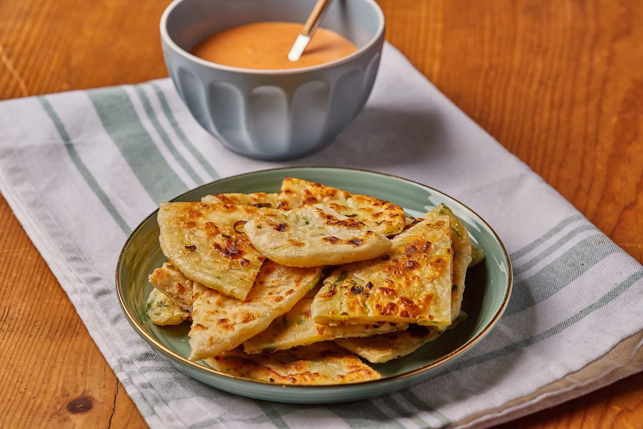 Ha pihent, átgyúrjuk, és 8 egyenlő részre osztjuk. Kigombócozzuk, és mindegyiket (ha szükséges, egy kevés liszttel) 10-12 cm átmérőjű körré nyújtjuk. Lekenjük a tetejüket nagyon vékonyan szezámolajjal, megszórjuk egy csipet sóval és egy kevés újhagymával, majd feltekerjük rúd alakúvá, ezután újra feltekerjük csiga alakúvá, és újra kinyújtjuk 10-12 cm-es körré.