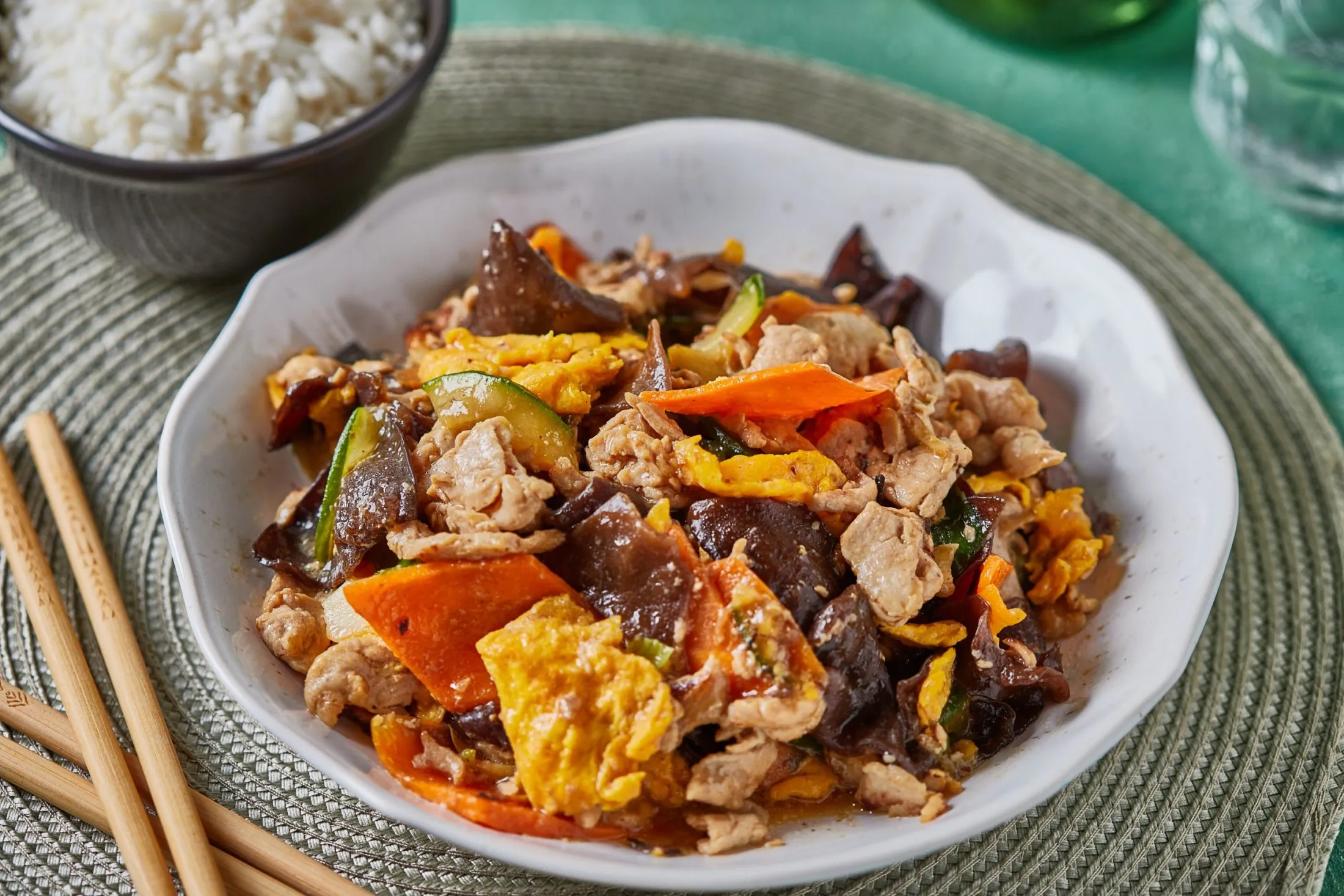 Hozzáadjuk a húst és a blansírozott, lecsepegtetett fafülgombát, majd az uborkát és a répát. Fűszerezésként beletesszük a szójaszószt, az osztrigaszószt, a cukrot, sót, borsot és a keményítős vizet, hogy besűrűsödjön. Belekeverjük a rántottát, és a tűzről levéve öntünk rá néhány csepp szezámolajat, végül főtt rizzsel tálaljuk.