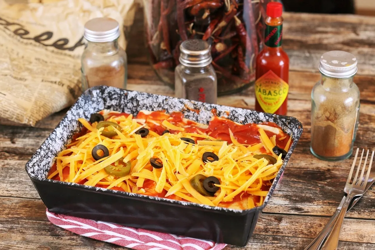 A tortillalapokra 1-1 csapott evőkanálnyi szószt kenünk, ráhalmozzuk a darált húst, és feltekerjük őket. A maradék szószból 2 evőkanálnynit a sütőtál aljára kenünk, majd szép sorban belerakosgatjuk a tortillákat. Meglocsoljuk a maradék szósszal, megszórjuk a reszelt cheddar sajttal, rádobunk pár szelet olívabogyót és jalapeno paprikát és 180 fokos sütőben kb. 35 percig sütjük.