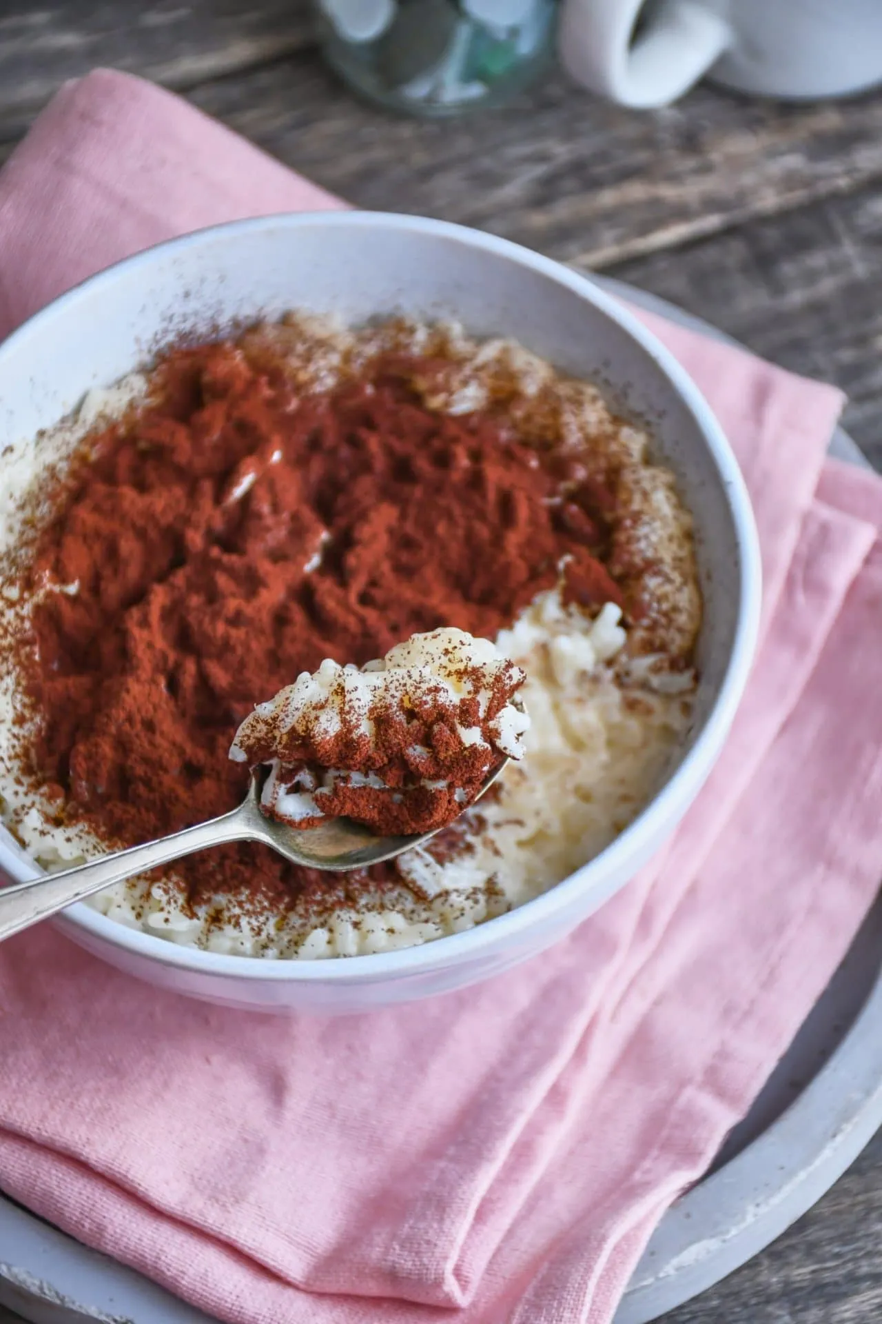 A rizst átmossuk és a vízzel felrakjuk főzni. Mikor magába szívta a vizet, hozzáöntjük a tej és a tejszín felét, hozzáadjuk a vaníliarúd kikapart magjait és magát a héjat is, valamint a cukrot. Folyamatosan kevergetve, közepes lángon tovább főzzük, majd ha a tejet és a tejszínt magába szívta, felöntjük a maradék tejjel, tejszínnel, és belereszeljük a citrom héját is. Ha már puha a rizs, elzárjuk alatta a lángot, kivesszük a vaníliahüvelyt, belekeverjük a vajat, és 5-10 percre lefedjük. Ezután átkeverjük, tálakba szedjük, és fahéjjal vagy kakaóporral megszórva tálaljuk.