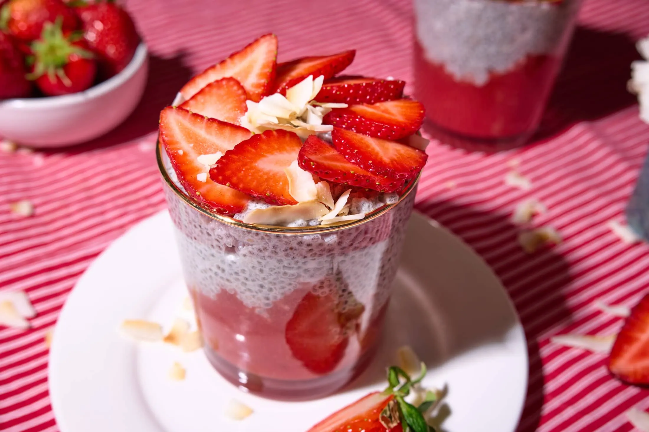 A poharak aljára öntjük az eperragut, majd rákanalazzuk a chiapudingot. Friss eperrel és kókuszchipsszel díszítjük.