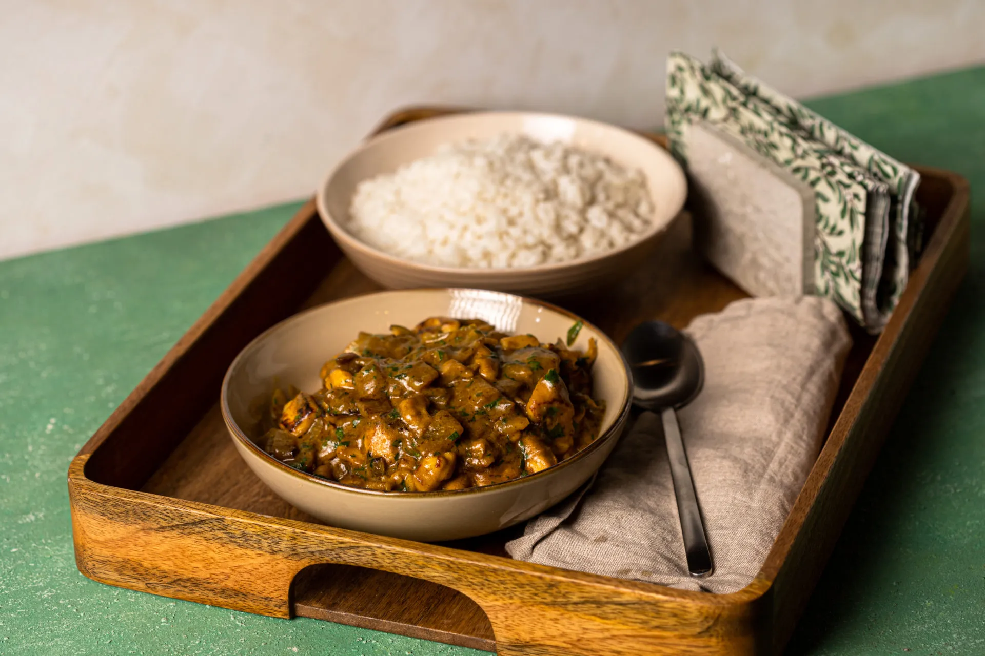 A kókusztejes csirkecurry elkészítéséhez először a csirkehúst 1,5 cm-es kockákra vágjuk, majd egy tálban 2 tk sóval és a mirinnel összekeverve 10 percig pácoljuk.