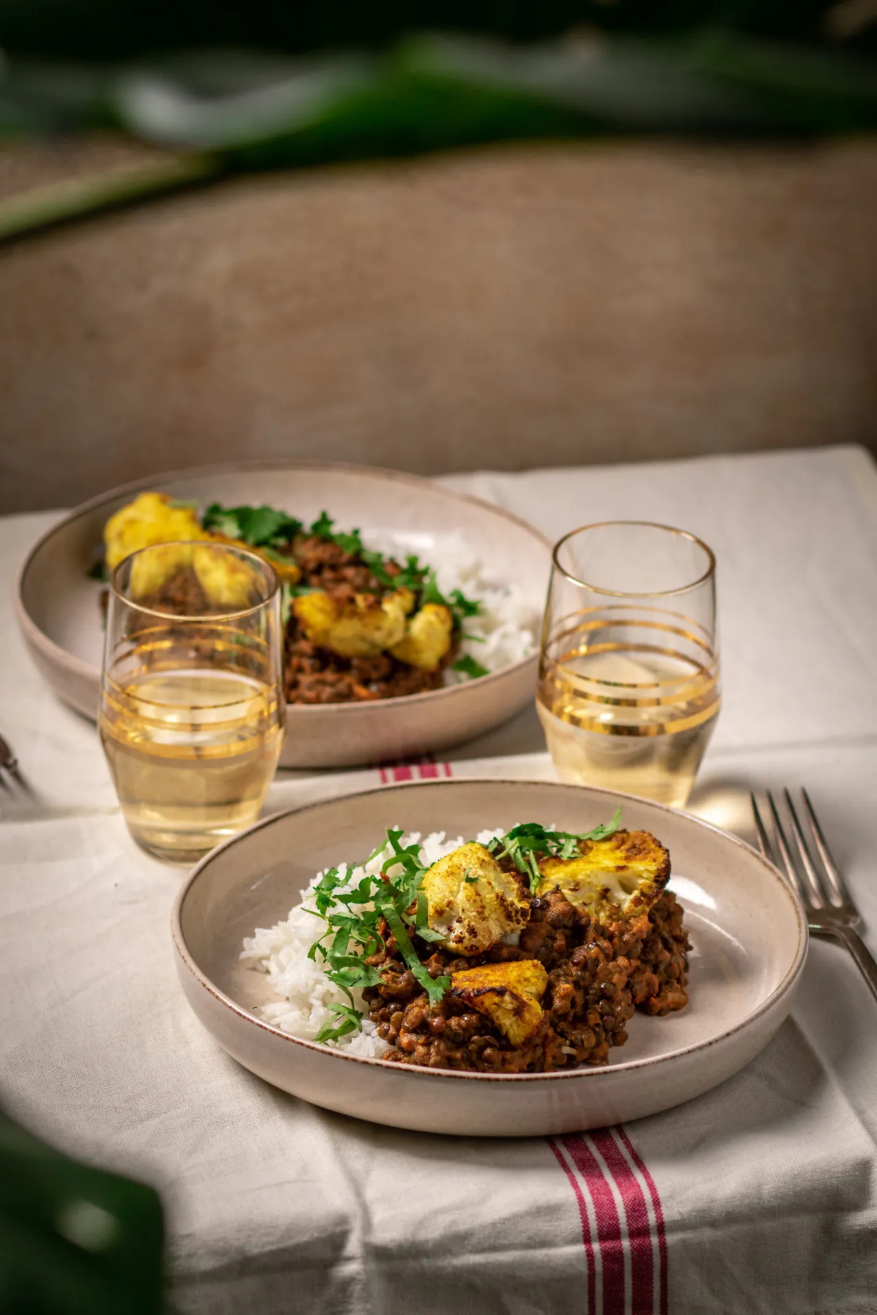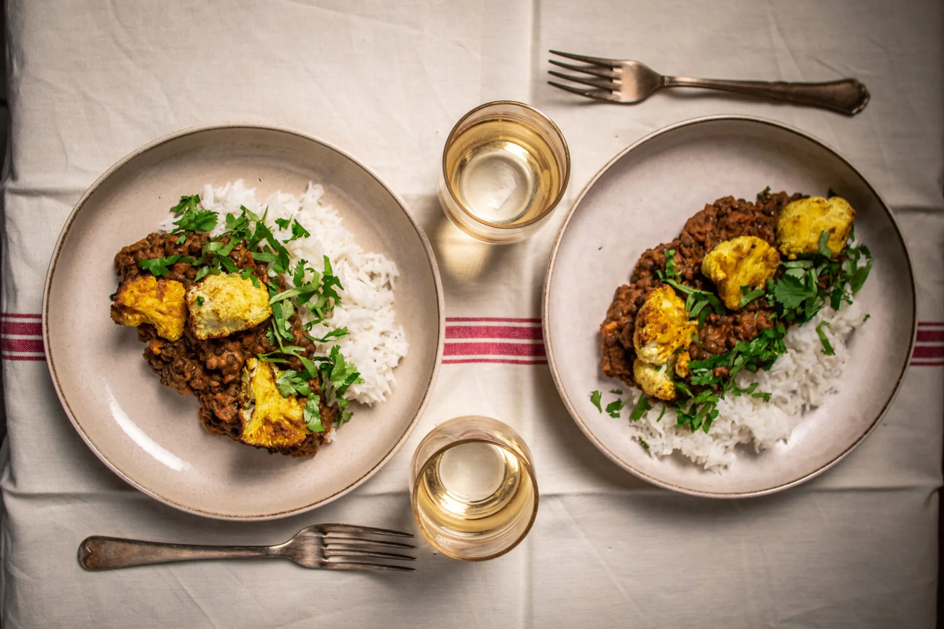 Kókusztejes-lencsés dahl sült karfiollal és rizzsel