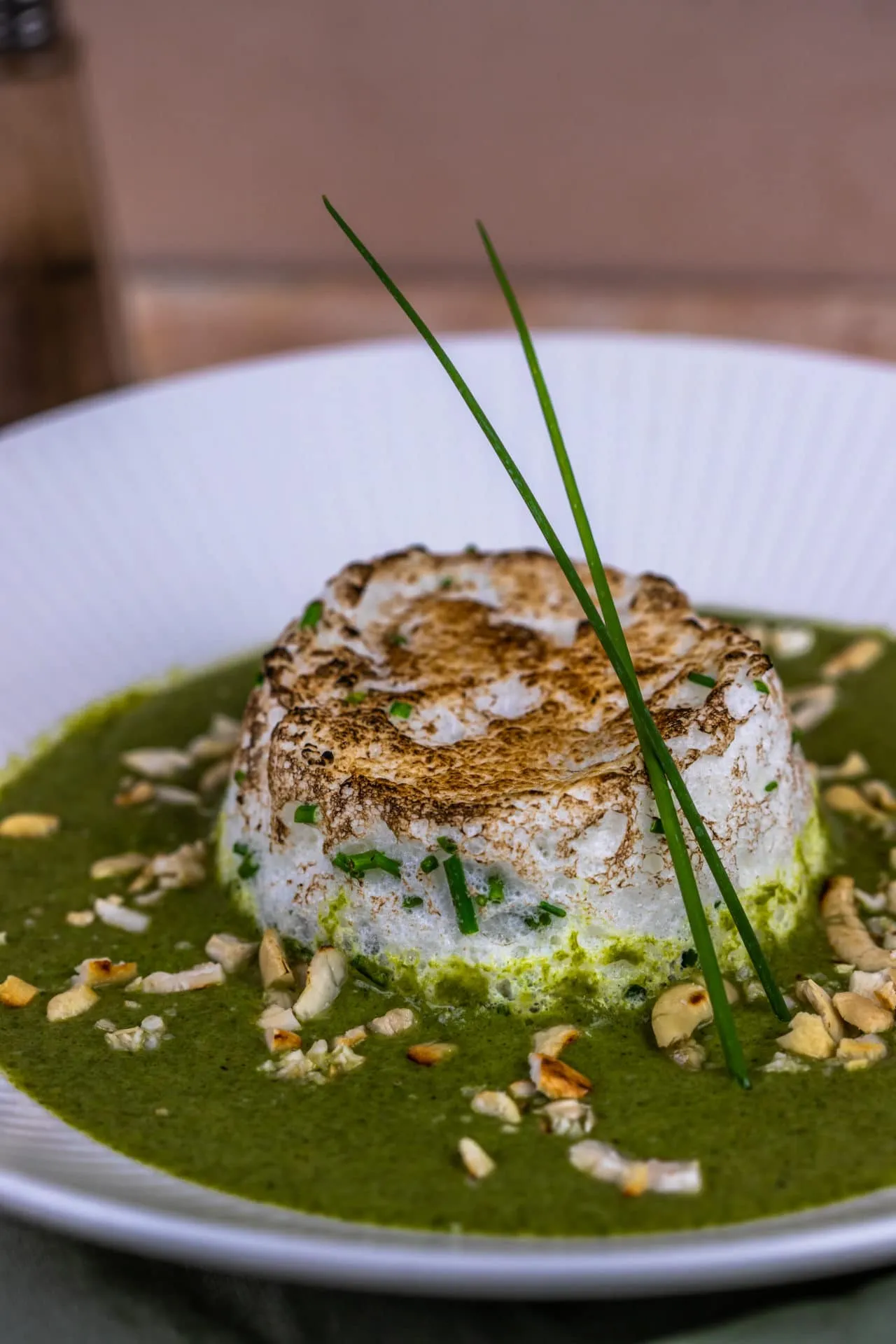 A kókusztejes spenótkrémlevest a tojáshabbal, a pirított kesudióval és kevés snidlinggel tálaljuk.