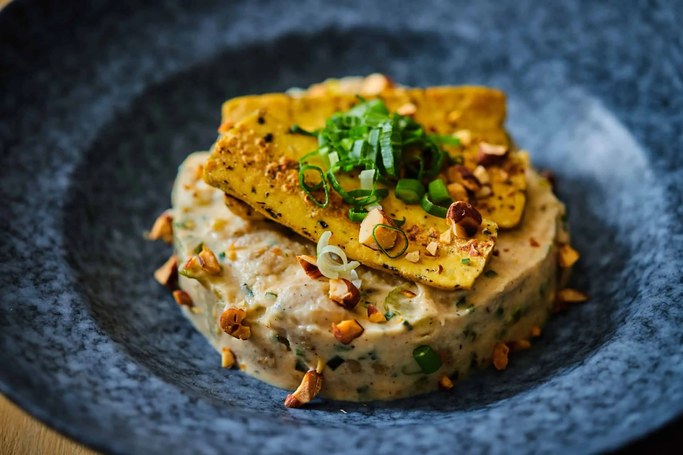 Ahogy kész vagyunk, tálalhatunk is: krémes gnocchi és sült tofu pirított mandulával megszórva, és végül a félretett újhagymakarikák is mehetnek rá.