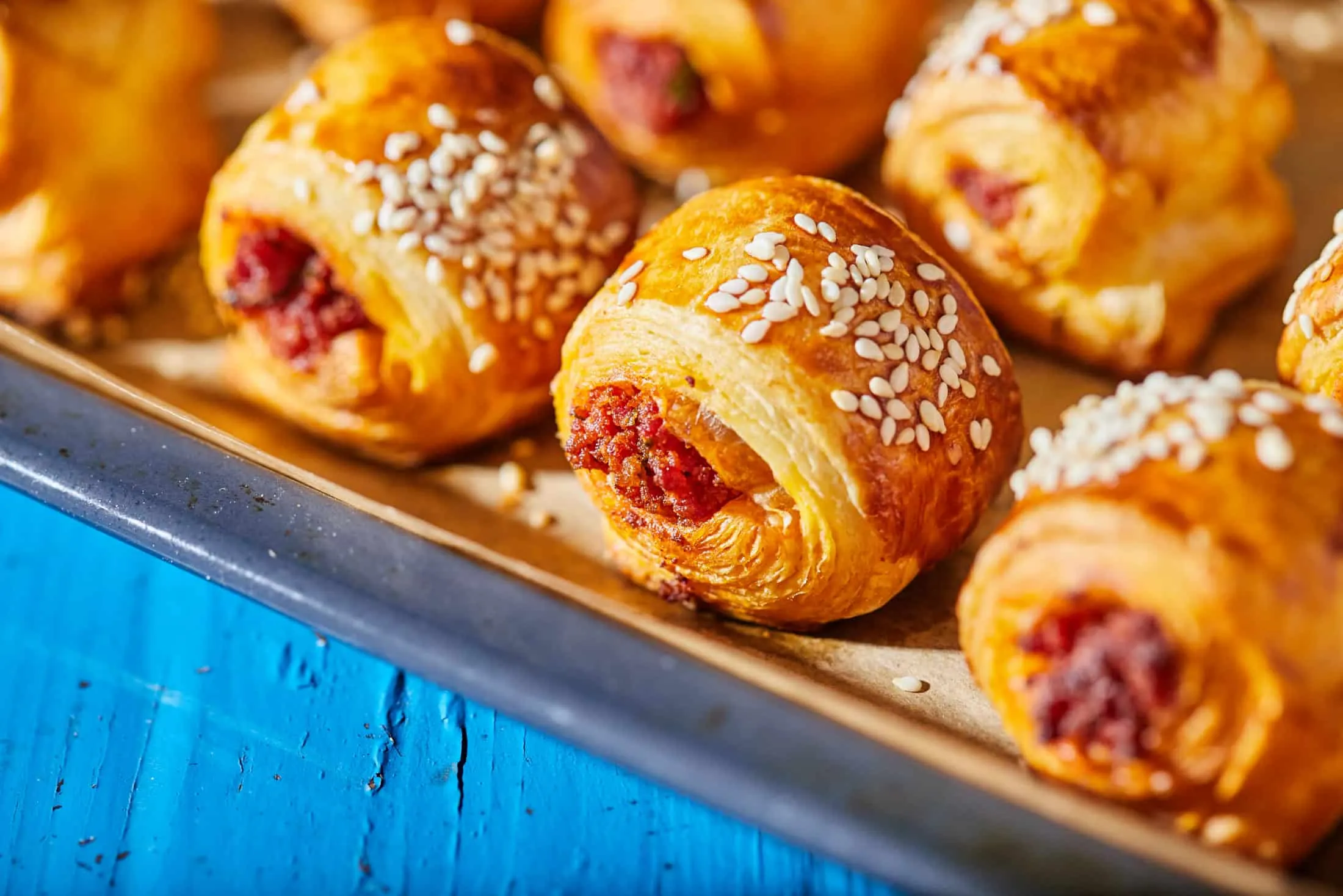Ezeket sütőpapíros tepsire rakosgatjuk, lekenjük a tetejüket a tejszínnel elkevert tojássárgájával, megszórjuk szezámmaggal és 175 fokra előmelegített sütőbe toljuk 18-20 percre, amíg szép aranybarnára sülnek.