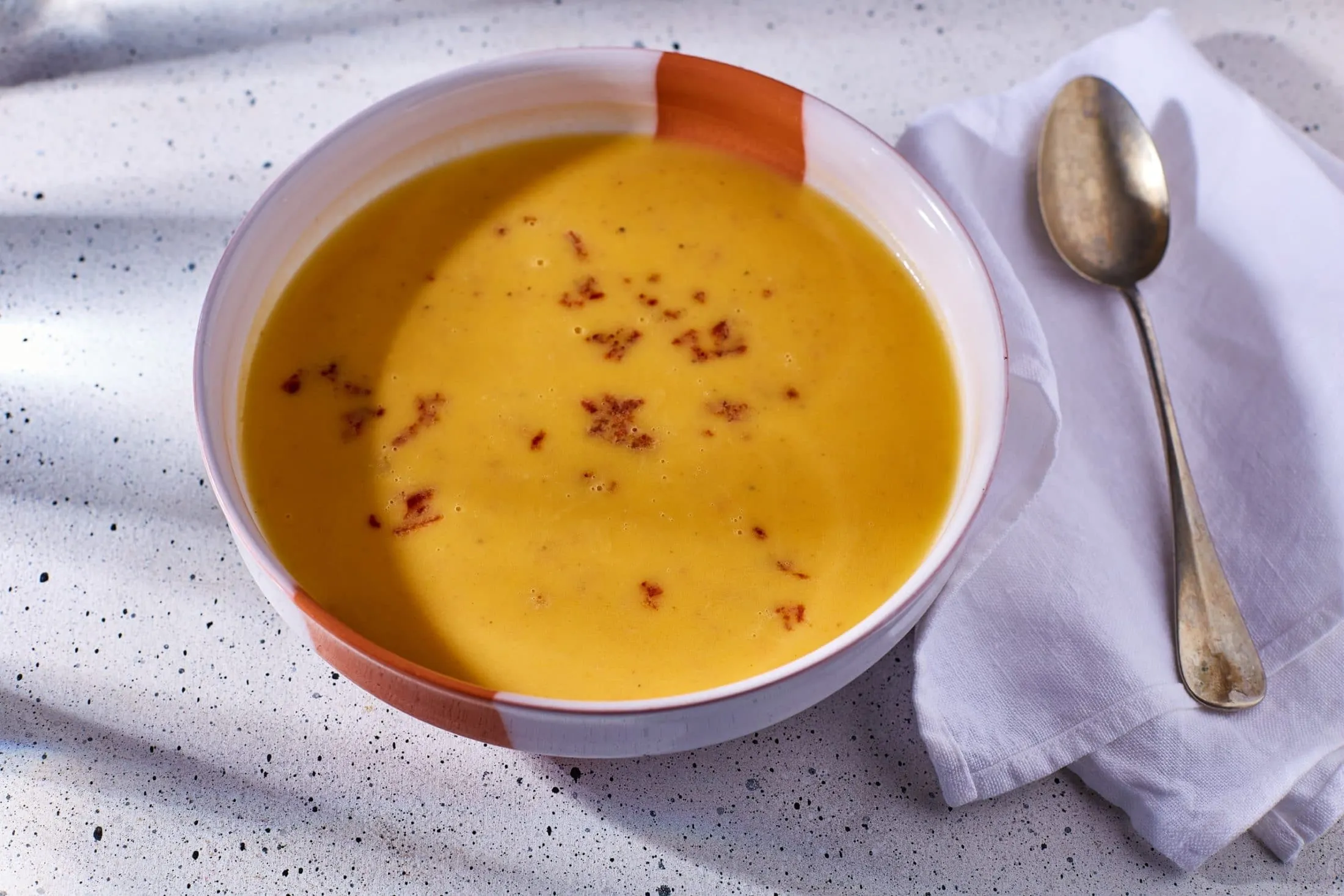 Egy lábasban zsírjára pirítjuk a kolbászt, ⅓ részét kiszedjük, a maradékot benne hagyjuk, és mehet rá a kétféle hagyma. Üvegesre pirítjuk, majd sózzuk, borsozzuk, ráreszeljük a szerecsendiót, belerakjuk a babérlevelet, az édesburgonyát, elkeverjük, felöntjük a vízzel, és addig főzzük, amíg a krumpli meg nem puhul. Ezután kivesszük a babérlevelet, leturmixoljuk a levest, ecettel ízesítjük, és a félretett kolbásszal, tejszínnel összekeverve tálaljuk.