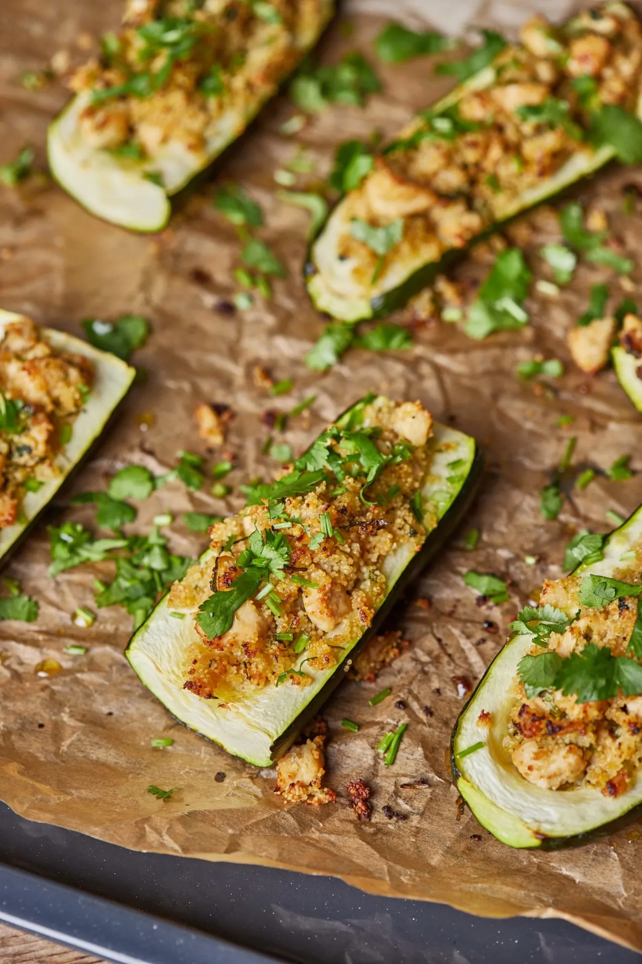 A cukkiniket hosszában elfelezzük, a magházat kikaparjuk, tepsire rakjuk, és 200 fokra előmelegített sütőben 20 perc alatt elősütjük.